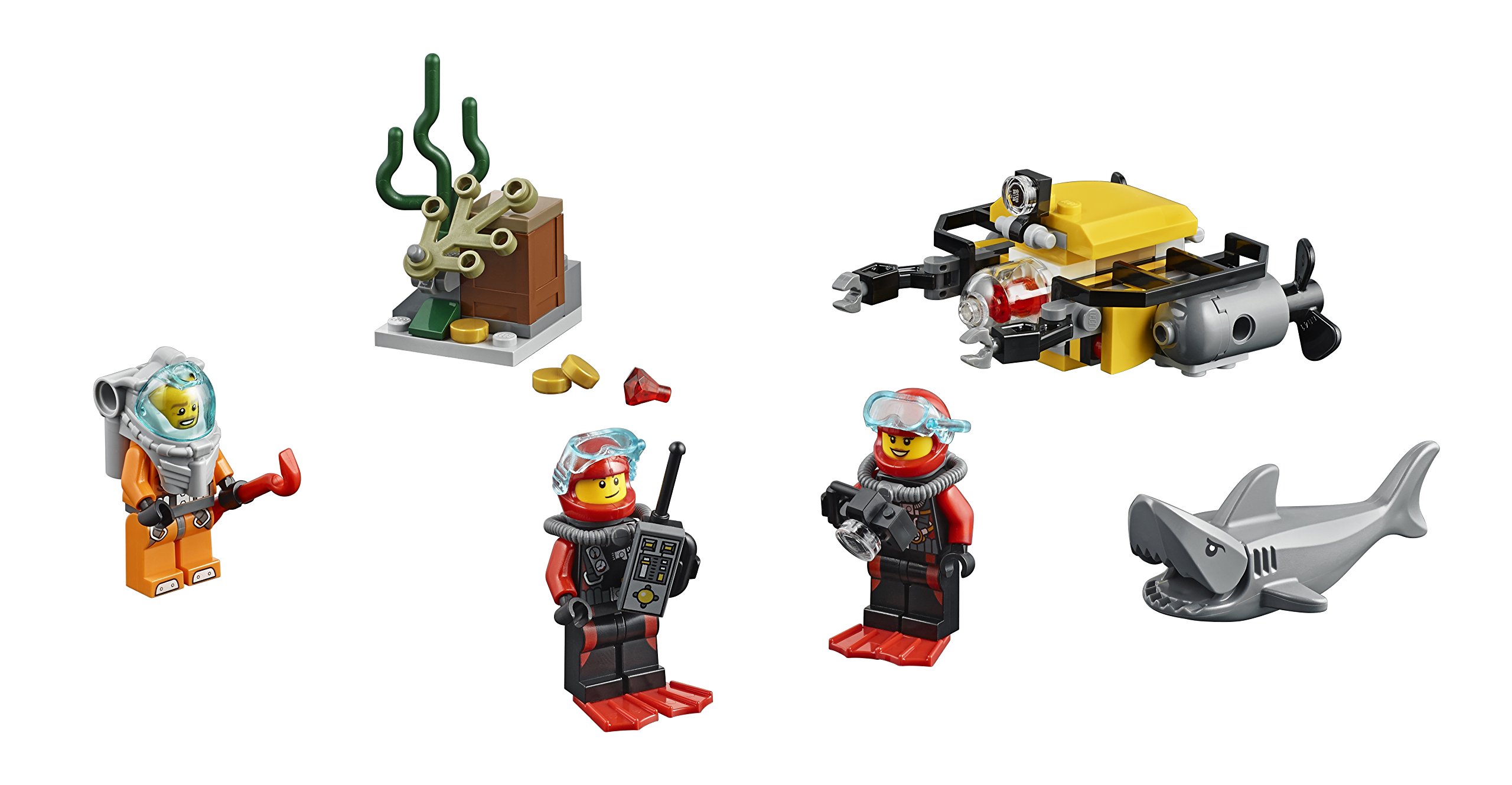 Explore the ocean's depths with the Deep Sea Starter Set! Enjoy underwater adventures with the Deep Sea Starter Set, featuring a remote sub, shark, chest, coins, camera, seaweed and 3 minifigures. Join the LEGO City deep-sea explorers on their search for lost treasure with the Deep Sea Starter Set! The diver has spotted a mysterious chest on the seabed and needs your help to free it from the seaweed. Take control of the remote sub and use its powerful robotic arms to release the chest and reveal the secret treasures hidden inside. But watch out for the snappy shark lurking in the dark water! Includes 3 minifigures: a deep-sea diver and 2 scuba divers.