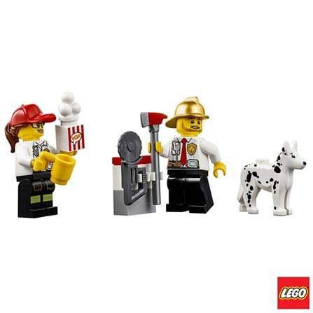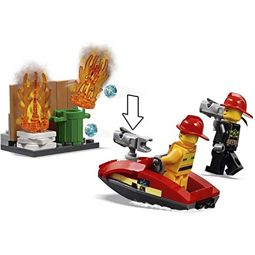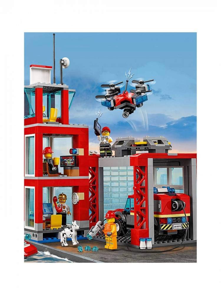 -This toy fire station features 4 LEGO City minifigures, including a fire chief, firefighters and fire dog figure. Plus, kids can use the toy drone with spinning rotors and a water scooter to reach fires quickly!
