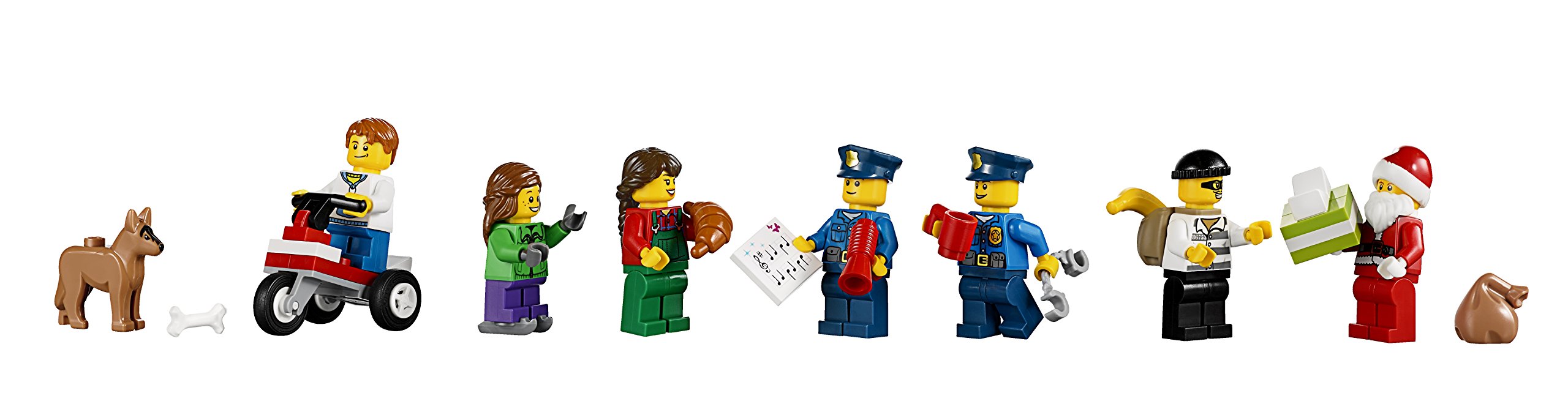 -Includes 7 minifigures with assorted accessories: a boy, woman, girl, crook, 2 policemen and Santa