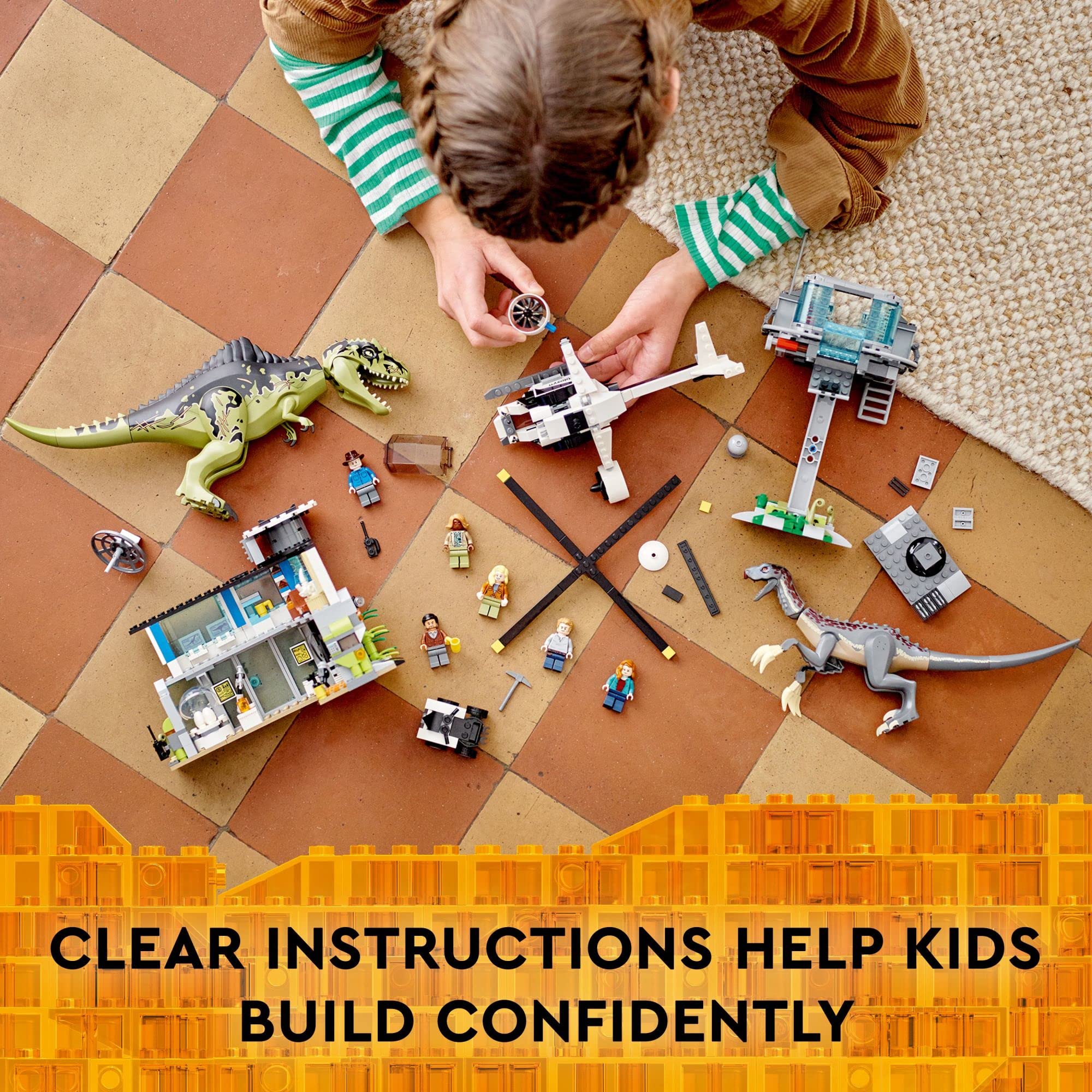 LEGO Jurassic World Giganotosaurus & Therizinosaurus Attack 76949 con 2 figuras de juguete de dinosaurio, vehículo todoterreno, helicóptero y garaje, regalos para niños, niños y niñas