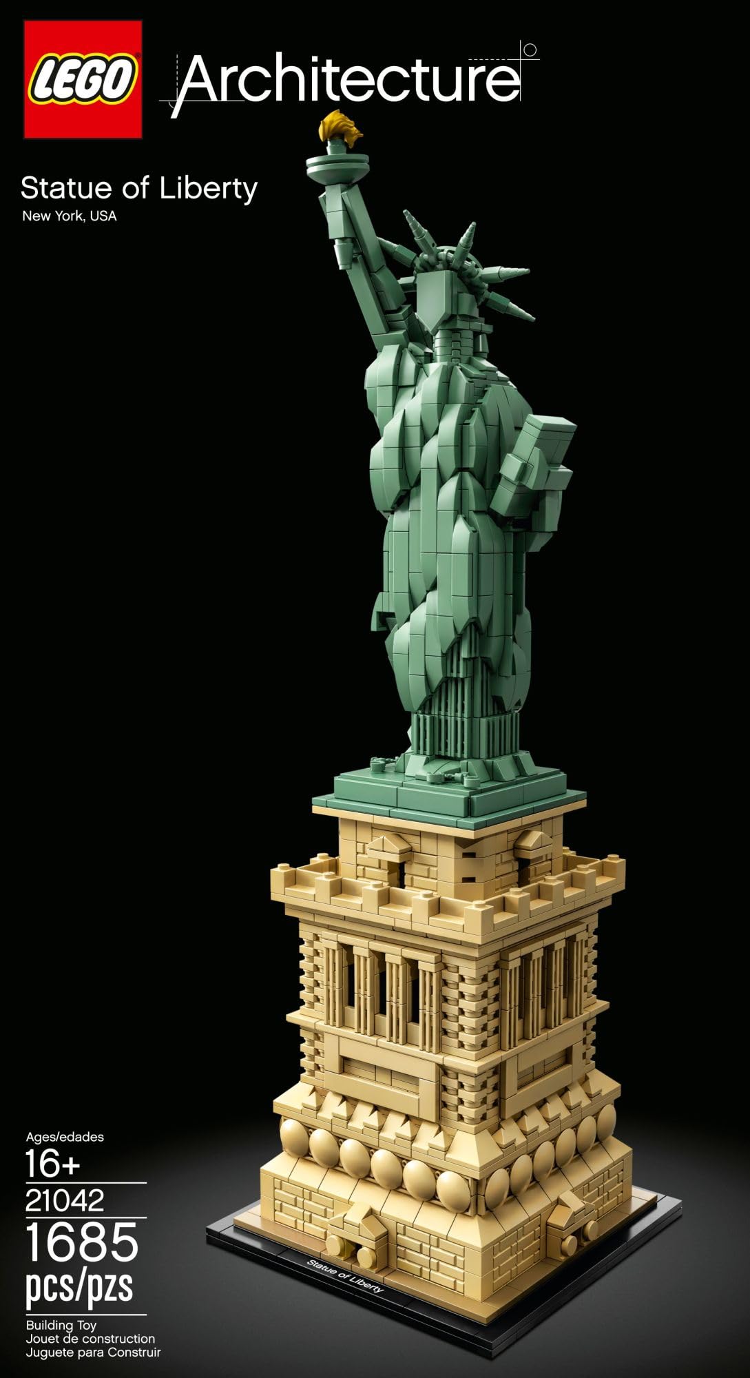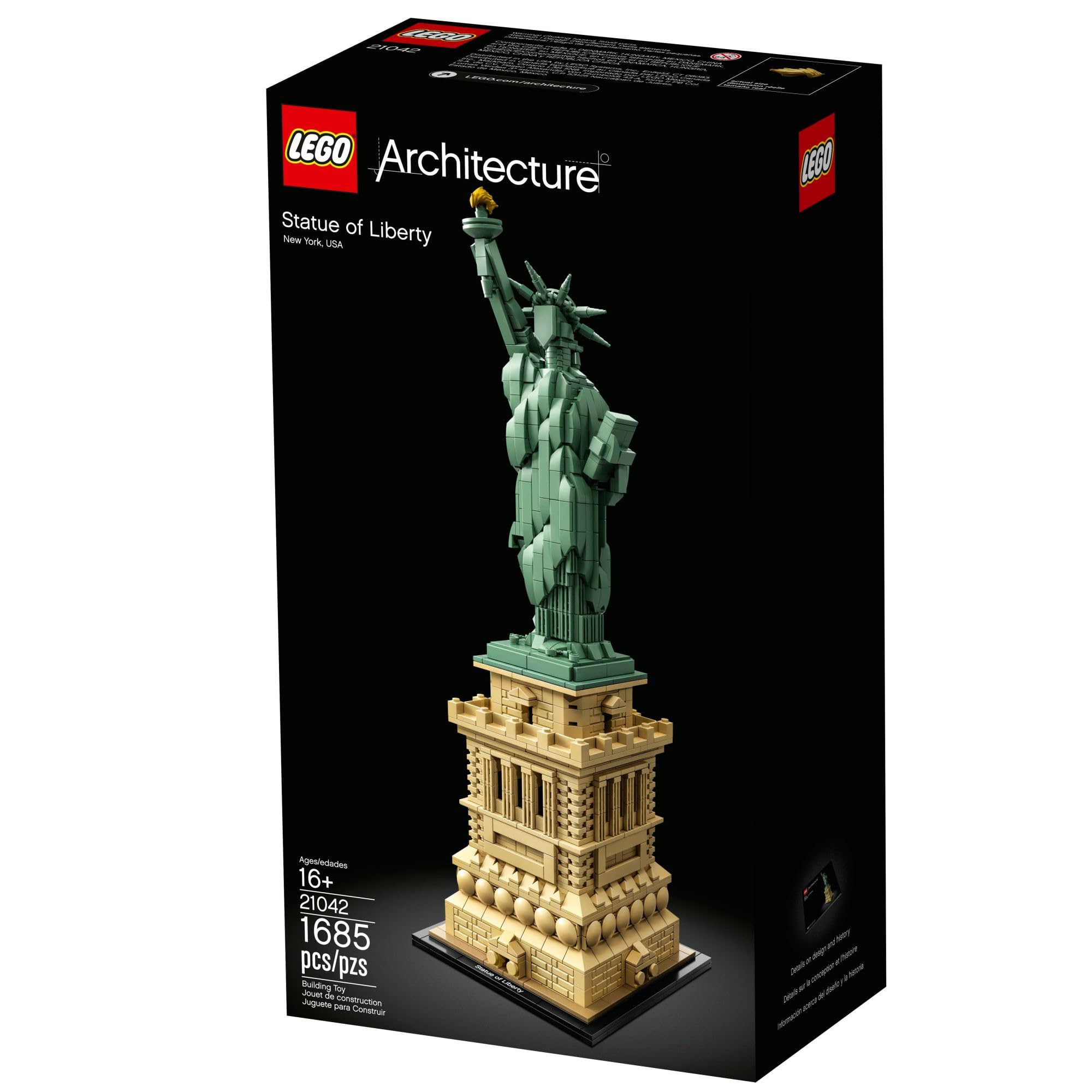Celebrate a monumental blend of architecture and sculpture with this LEGO Architecture The Statue of Liberty collectable architecture model building kit (21042). America’s iconic symbol of freedom shines her golden torch more than 305 feet above Liberty Island in New York harbor, welcoming seafarers from around the globe. This impressive LEGO Architecture model faithfully interprets the monument’s harmonious blend of sculpture and architecture with its intricately detailed shield-lined pedestal, brick detailing, and columned balconies. The beautifully crafted Lady Liberty statue features the iconic flowing robes, broken shackles, tablet, 7-ray Statue of Liberty crown, and an upraised arm bearing a golden torch. Finished with an authentic sand-green and beige color scheme and a decorative nameplate, this collectable architecture model delivers a highly satisfying building experience. LEGO architecture model building kits make a truly symbolic centerpiece for the home or office, as well as a magnificent birthday or Christmas New York City gift for teens and adults. The Statue of Liberty sculpture measures over 17” (44cm) high, 5” (14cm) wide, and 5” (14cm) deep. Contains 1,685 Pieces.