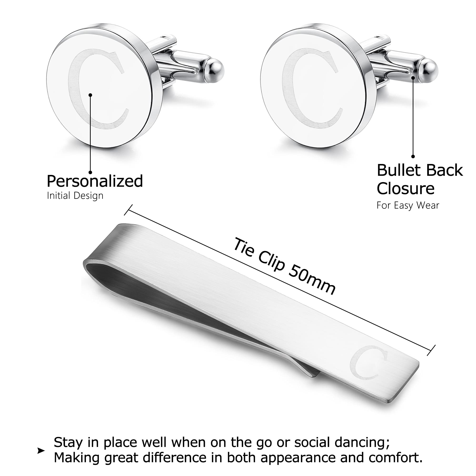 -DURABLE SPECIAL:Classic cufflinks and tie bar design with initial engraved on them.Shiny finish on cufflinks and matte finish on tie clip.They will add a sophisticated touch to his look.