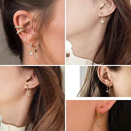 LOYALLOOK 6 pares de pendientes colgantes de aro con forma de estrella y luna Evil Eye Huggie Hoop bonito pendiente CZ Spike con bisagras borla cadena gota colgante cartílago pendiente para mujeres y hombres