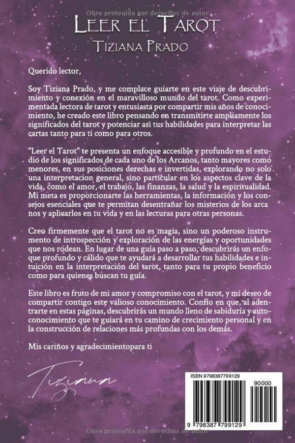 Soy Tiziana Prado, y con gran cariño, te presento mi libro "Leer el Tarot", una guía detallada y amigable diseñada para ayudarte a dominar el arte de la interpretación de las cartas del tarot RIDER WAITE SMITH. Este libro de más de 800 páginas se convertirá en tu recurso esencial para profundizar en la forma de entender los mensajes del tarot y así mejorar tu vida y la de aquellos que acudan a ti en busca de guía. ¿Qué hace especial a "Leer el Tarot"? Un enfoque cercano y profundo en el estudio de los significados de los arcanos mayores y menores, en sus posiciones derechas e invertidas. Interpretaciones no solo generales, sino especificas en áreas clave de la vida: amor, trabajo, finanzas, salud y espiritualidad. Cada carta (su significado) ocupa como mínimo 5 paginas, cubriendo todo lo que necesitas interpretar. Fácil de entender, tanto para quienes se inician como para quienes ya tienen experiencia. Consejos prácticos a través de ejemplos y herramientas para mejorar tu intuición y forma de interpretar las lecturas del tarot, tanto para ti como para otros. Un enfoque personal y afectuoso que te guiará en tu camino de crecimiento personal y conexión con los demás. ¡Más de 1000 ejemplares vendidos en su versión ebook! Descubre una forma profunda y practica de entender el tarot En "Leer el Tarot" Mi libro, comparto contigo mi pasión y experiencia en el mundo del tarot, para que puedas descubrir un camino lleno de sabiduría y autoconocimiento. Al sumergirte en estas páginas, aprenderás cómo profundizar en tus relaciones con los demás y guiar tu camino hacia el crecimiento personal, ademas de mejorar tus interpretaciones, mirando mas allá de las generalidades. ¡Empieza hoy tu fascinante aventura en el universo del tarot con este libro indudablemente único! No esperes más para adentrarte en el emocionante mundo del tarot y descubrir cómo esta práctica milenaria puede enriquecer tu vida y la de aquellos a quienes guíes. ¡Adquiere tu copia de "Leer el Tarot" ahora y déjate guiar por el consejo de los arcanos! Mis Cariños y agradecimiento para ti por adelantado, Tiziana Prado **Aclaración: Para que cupiera todo el contenido en el limite de paginas que establece Amazon, he tenido que utilizar la version de tapa blanda en escala de grises como asi también evitar espacios innecesarios. Es un libro muy completo y con utilidad en cada sección, es por ello que no lo he dividido en series.