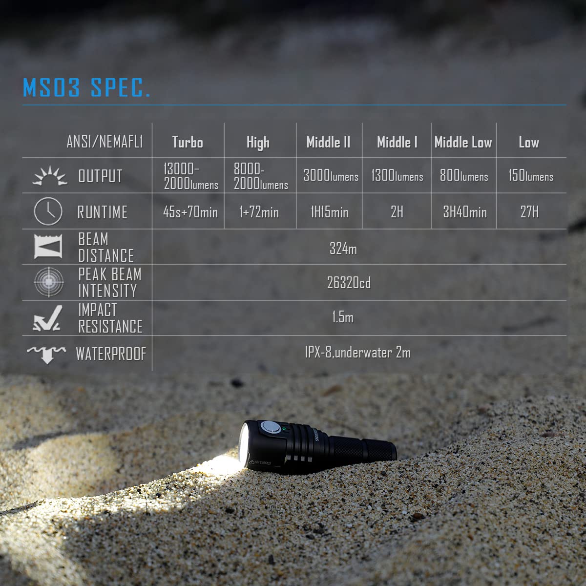 -TOUGH & SMART DESIGN: IMALENT MS03 is made of hard anodizing aircraft-grade aluminum alloy, and it is IPX-8 waterproof and dustproof, which makes the flashlight more durable and tough.