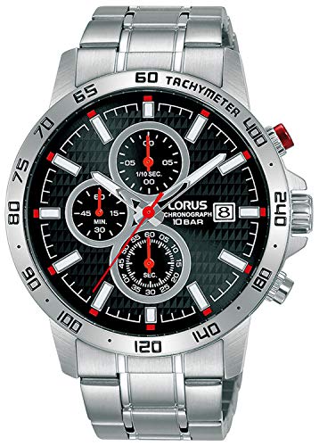 Lorus mens watch. Silver stainless-steel case and silver Stainless Steel strap. Black dial. Quartz movement. Deployment clasp closure. Water resistance of 100 meters.