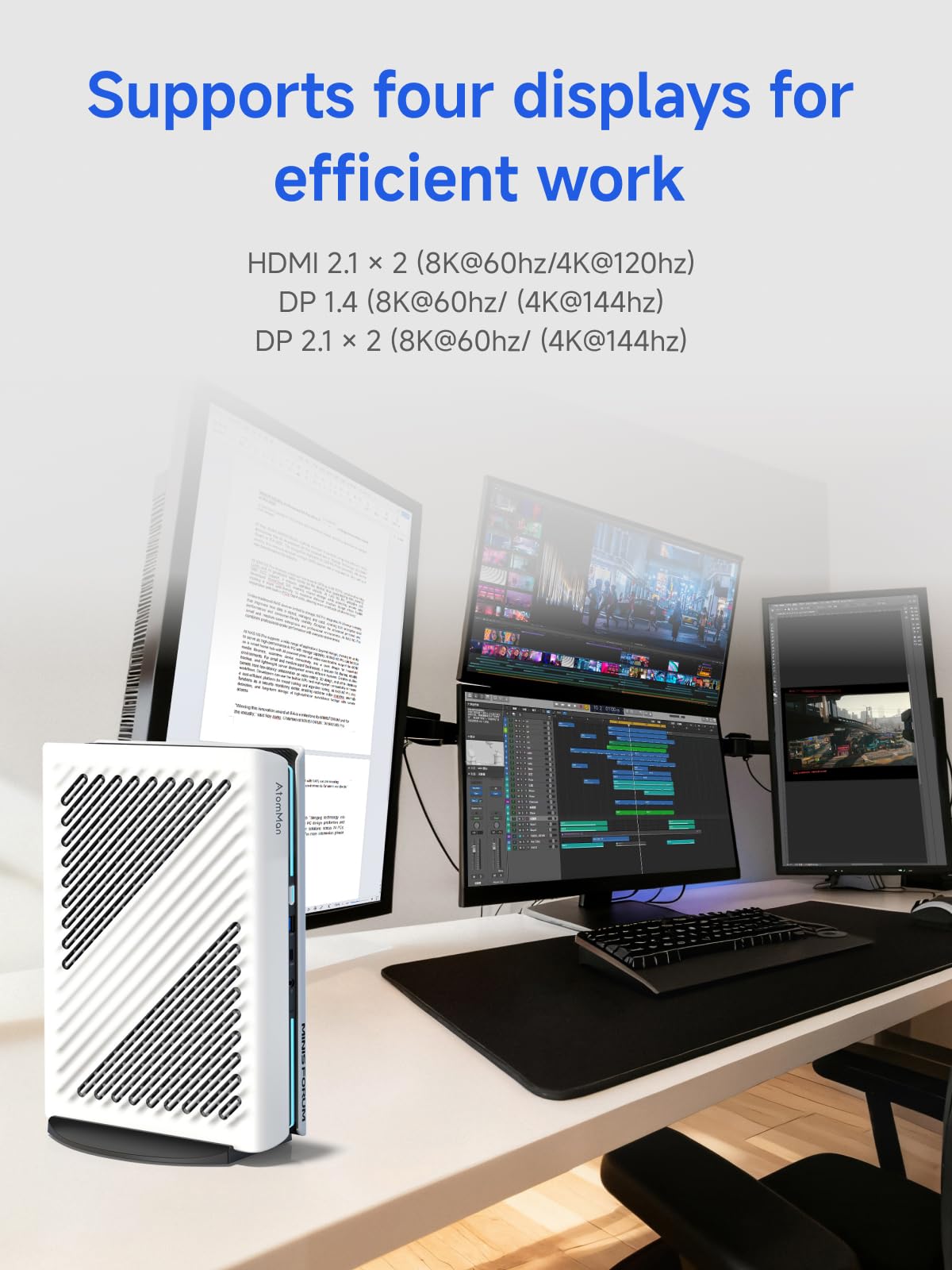 -【Advanced Connectivity & Quad 4K Output】Designed for high-productivity setups with 5Gb Ethernet, Wi-Fi 7, multiple USB 3.2 Gen2 ports, and up to five display outputs including 3×DP and 2×HDMI supporting quad 4K displays, all housed in a compact 3.8L vertical chassis with customizable RGB lighting and dedicated control software for performance and system management