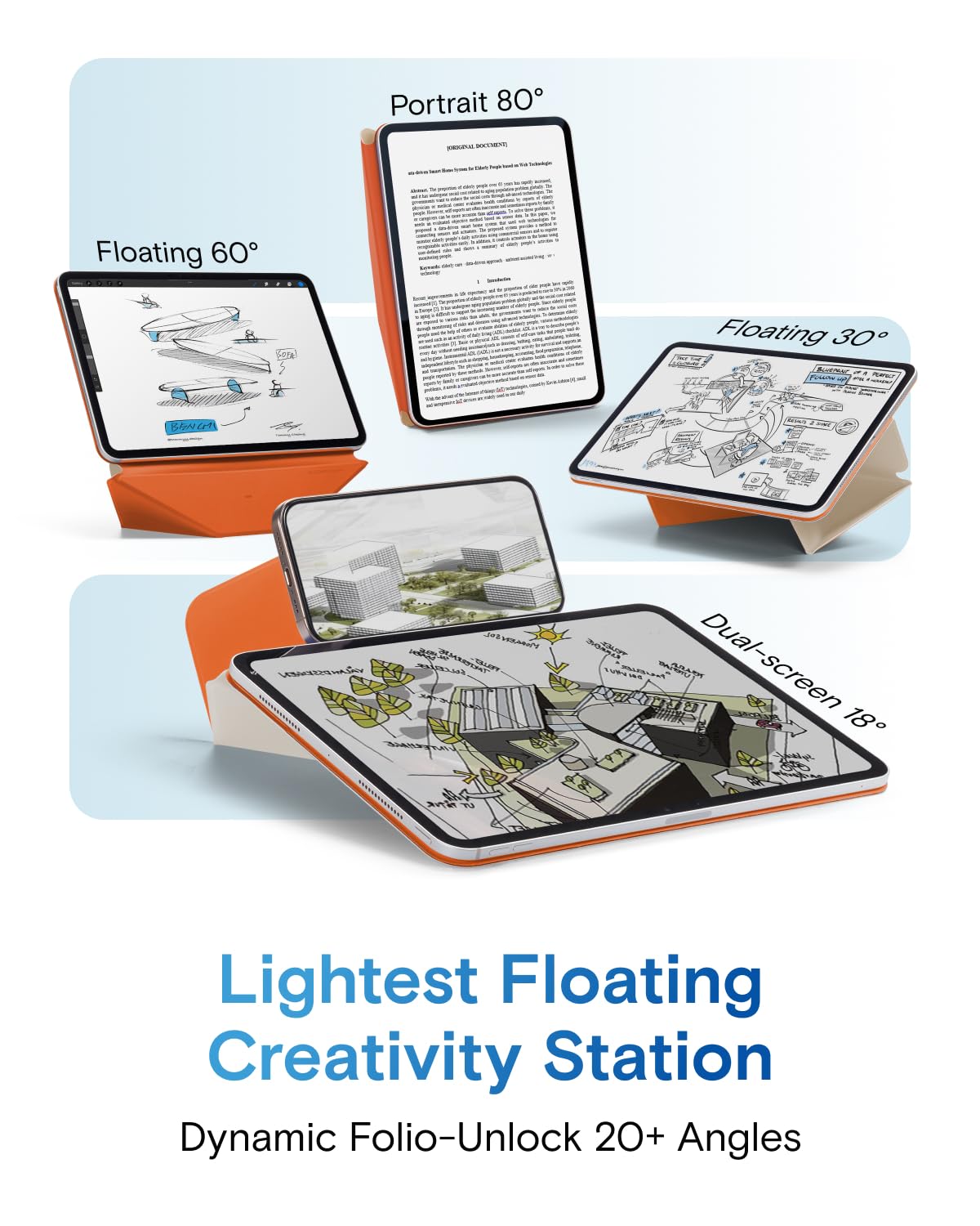 -Ultimate Ergonomic Floating Modes - MOFT Dynamic Folio Case makes iPad ergonomics effortless for mobile creativity - featuring a single-piece structure that effortlessly folds into a workstation lifting iPads up 2-inches. Frictionless angle shifts between 30° and 60° keep you aligned in your input-output framework.
