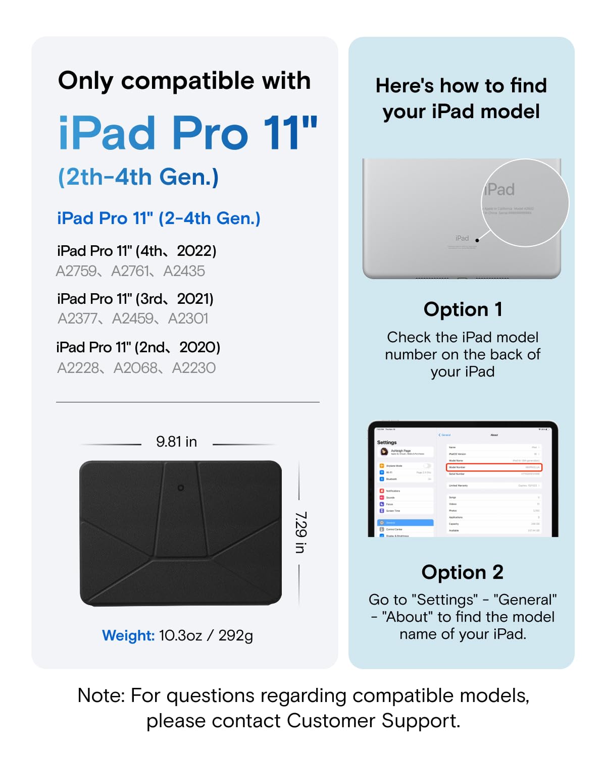 -Compatibility - Exclusively compatible with iPad Pro 11-inch (2nd/3rd/4th Generation, 2020/ 2021/ 2022) (Model:A2228, A2068, A2230, A2377, A2459, A2301, A2759, A2761, A2435) Note: It will not be compatible other model. Please check your iPad model before purchase. For questions about compatible models, please feel free to contact us.