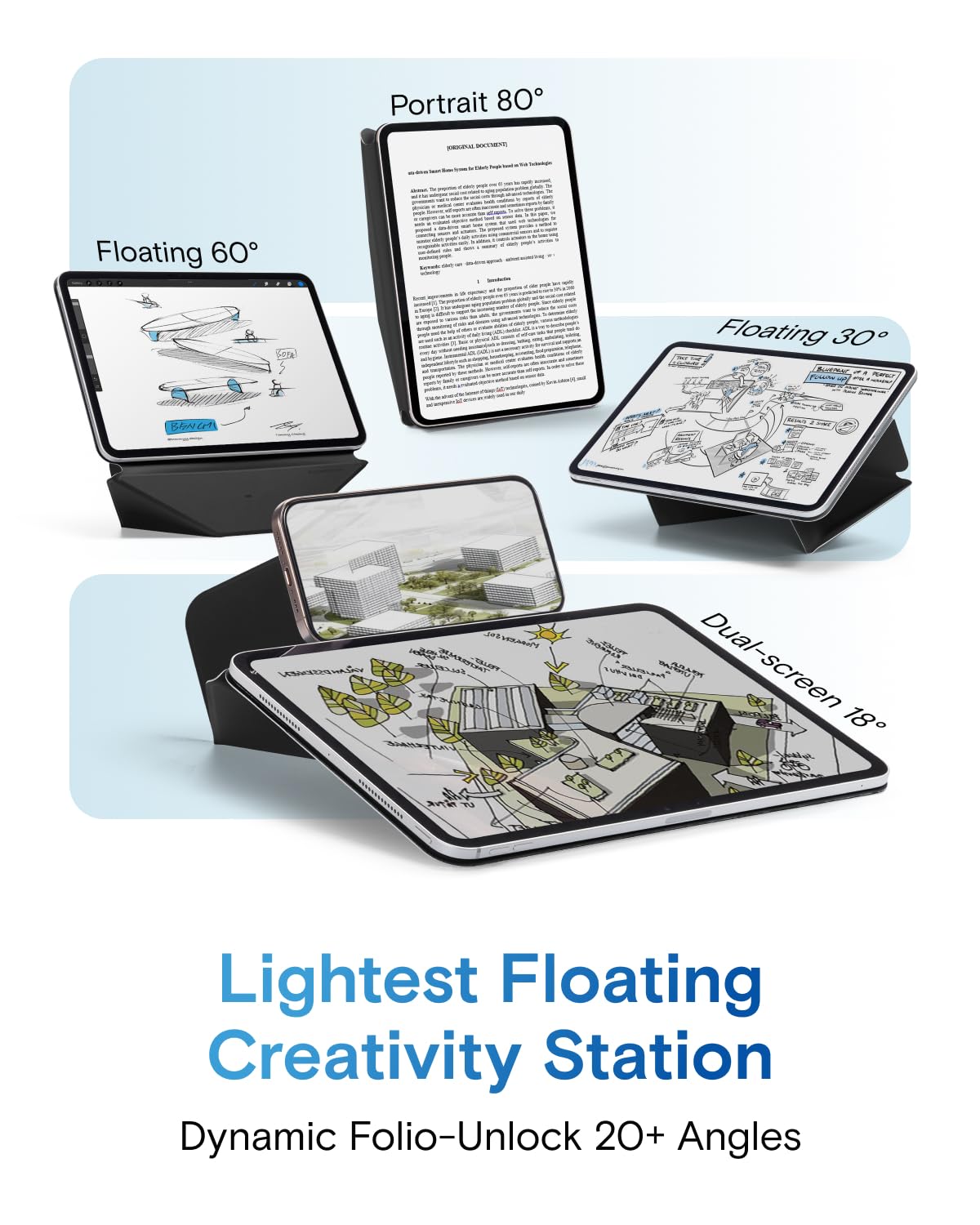-Dynamic Angles, Move with Flow - The Dynamic Folio with 20+ adjustable angles for iPad offers fluid angle adjustments that flow with your every need. Effortlessly shifting from work to creativity, it combines minimalist design with versatile functionality, enhancing your dynamic lifestyle.