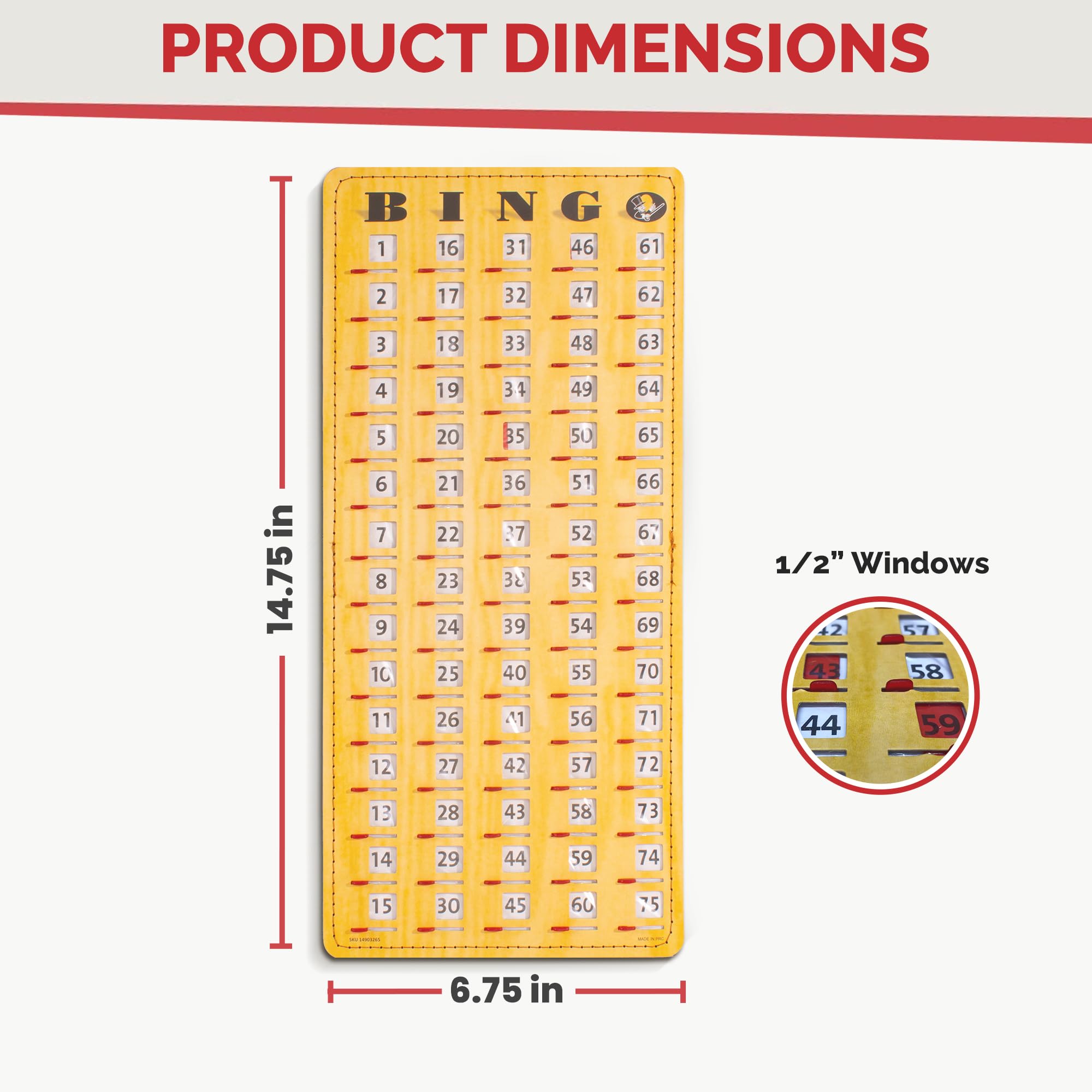 -REUSABLE BINGO BOARD WITH SLIDES: Perfect for endless bingo games played by adults or kids. With its classic Tan Woodgrain face, each master bingo shutter card with sliding windows measures 14.75" L x 6.75" W with 1/2” windows and has a protective clear film to ensure the bingo card is always protected and spotless