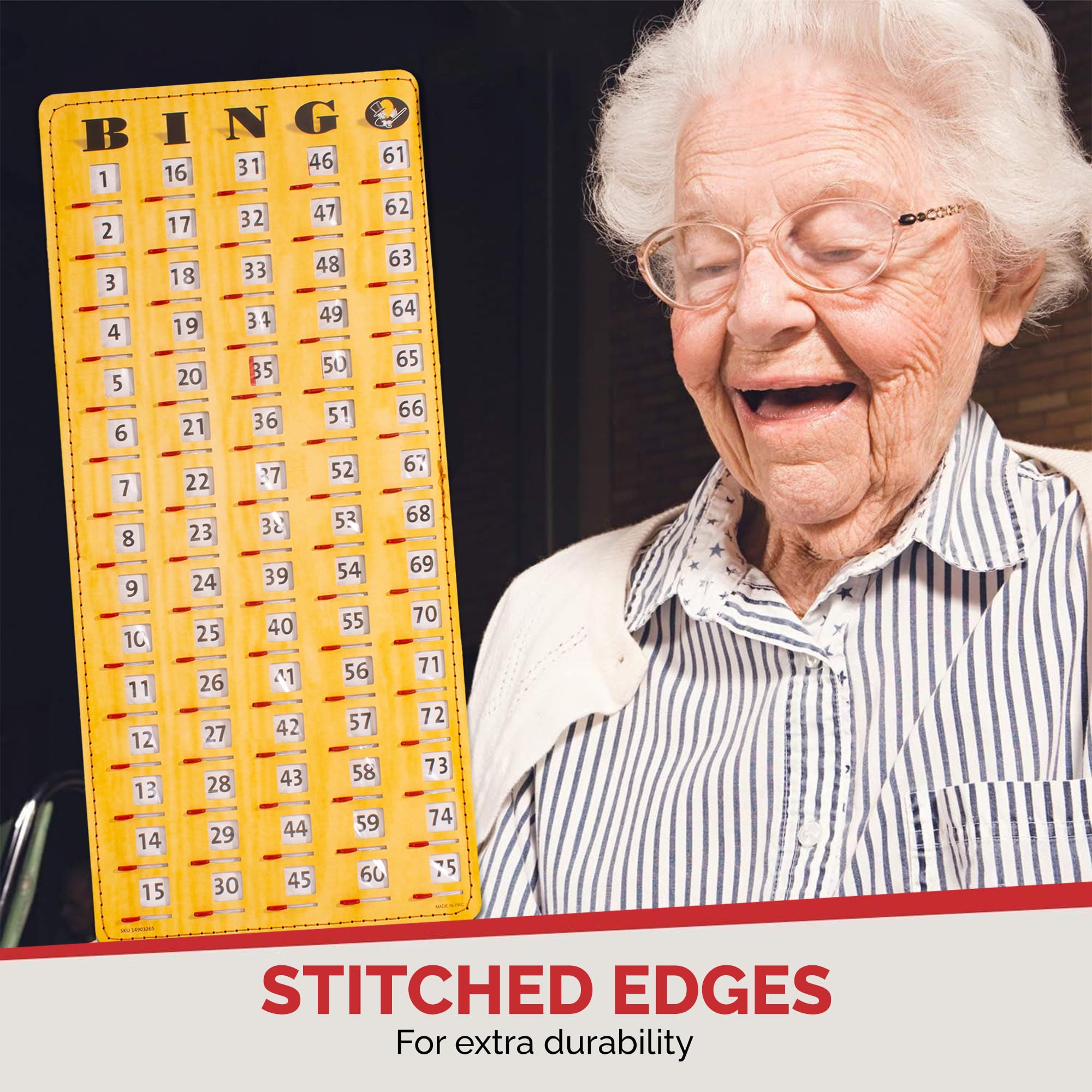 -CONVENIENT HANDHELD DESIGN WITH STICHED SIDES: Our bingo slide cards feature stellar 6-ply cardboard construction. The side stitching prevents peeling and damage over time. This bingo calling board does not require wasteful bingo daubers, bingo paper or messy bingo chips that can easily become lost