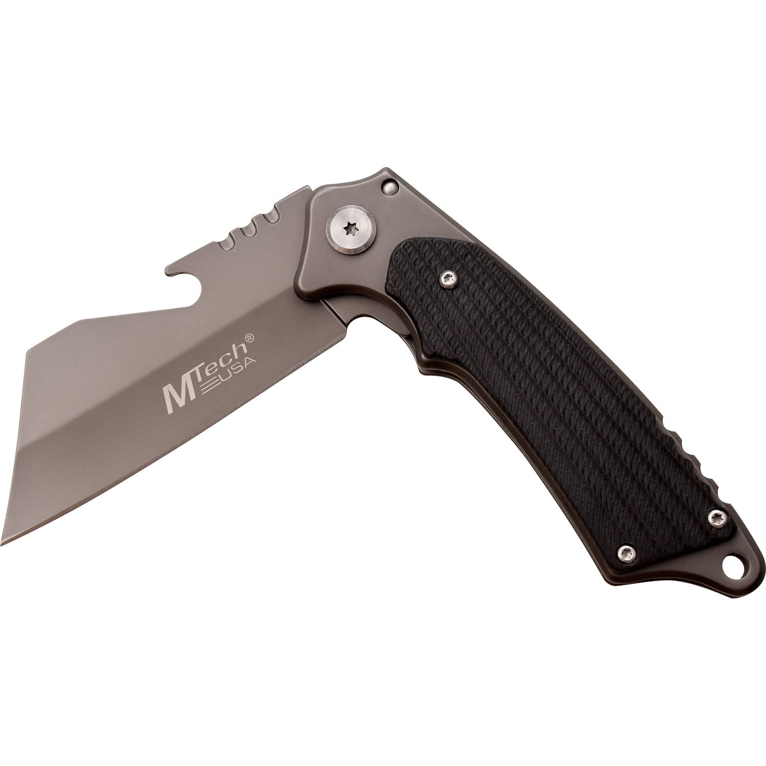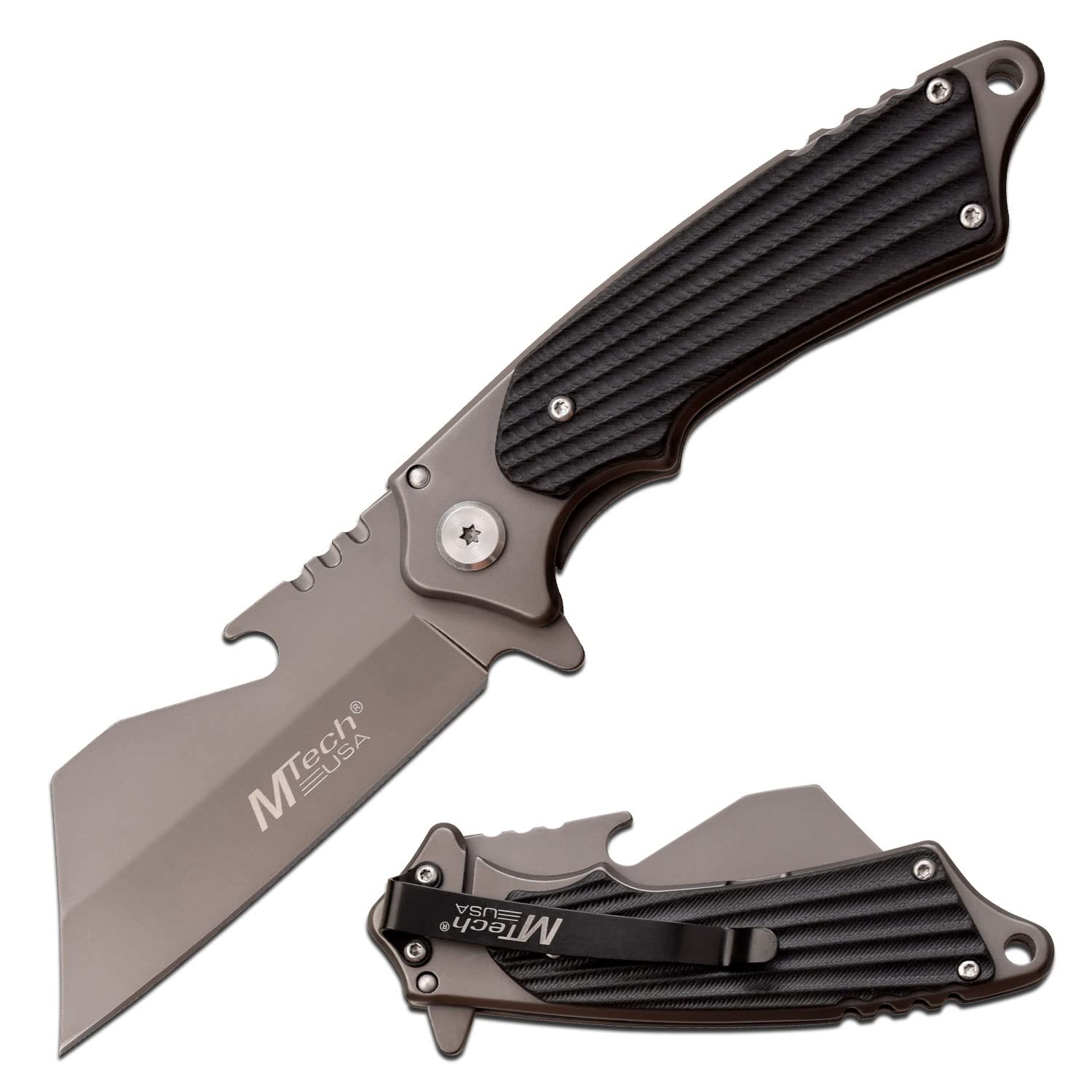 MTECH USA - Cuchillo plegable - Hoja de acero inoxidable TiNite gris con abridor de botellas, mango de acero inoxidable con básculas G10 negras, clip de bolsillo, bloqueo de revestimiento - EDC - MT-A1186GY, Multi