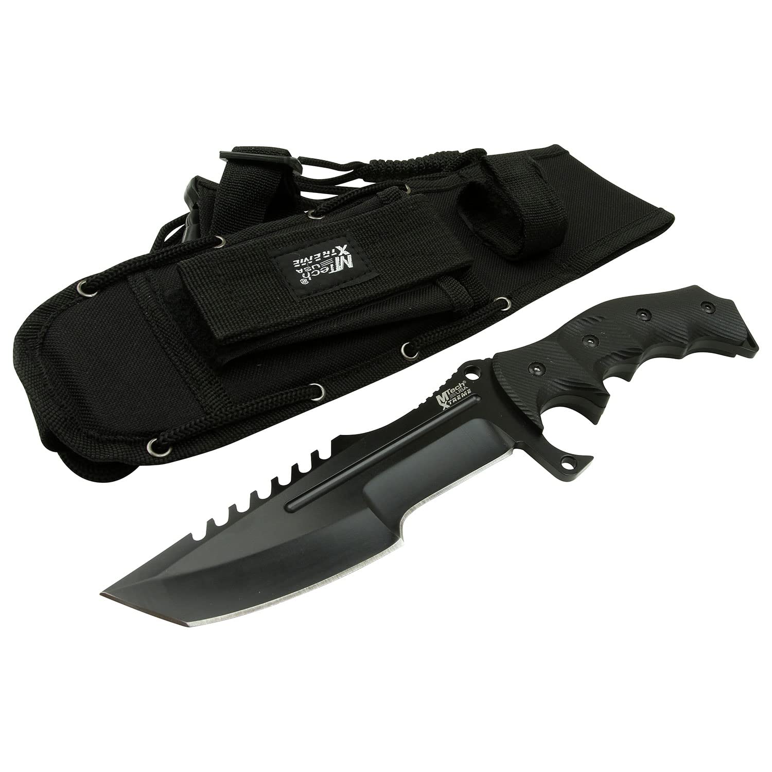 The MTech USA Xtreme Fixed Blade Tactical Knife (model MX-8054) features a black tanto blade and a black G10 handle, with an 11-inch overall length. Designed for tactical purposes with combat in mind, this hefty blade has saw back serrations along the spine and a blood groove. This fixed blade knife features a 5-1/2-inch, 5.5mm thick, 440 black stainless steel tanto style blade. Grade 440 stainless steel contains more carbon, giving it excellent hardness and edge retention. The black G10 handle offers a superior grip in even the wettest of conditions and has an extended guard for added protection. The handle offers finger grooves for an even more comfortable grip and added control and has a lanyard hole on the end allowing you to attach additional para cord. It comes complete with a black nylon sheath for easy and safe carry. MTech USA Xtreme offers a variety of both tactical fixed blade and folding knives that are made with thicker and higher grade materials such as 440A and 440C stainless steel blades.