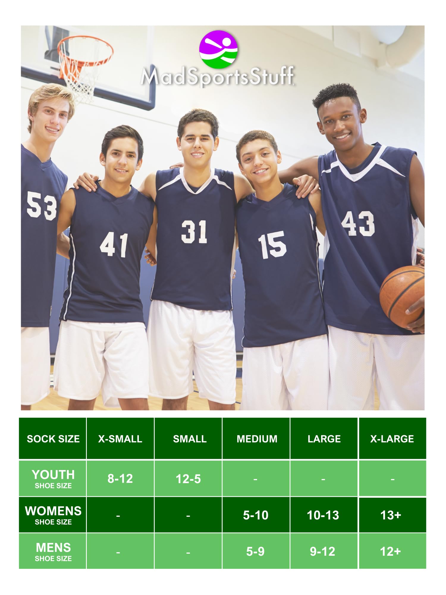 -While other athletic crew socks advertise one size fits most – often you instead receive basketball team socks that are too long, too small or too tight around the calves. Madsportsstuff sports socks come in standard sizes that are accurate to fit, small (youth shoe size 12-5); med (women shoe size 5-10); large (men shoe size 9-12); & extra large (women shoe size 13+; men shoe size 12+). Whether for outdoor basketball fun or any other activity, you get a great fitting sock every time.