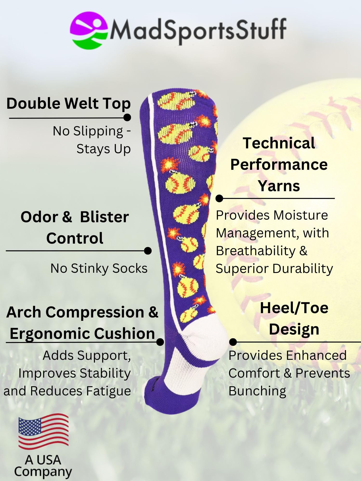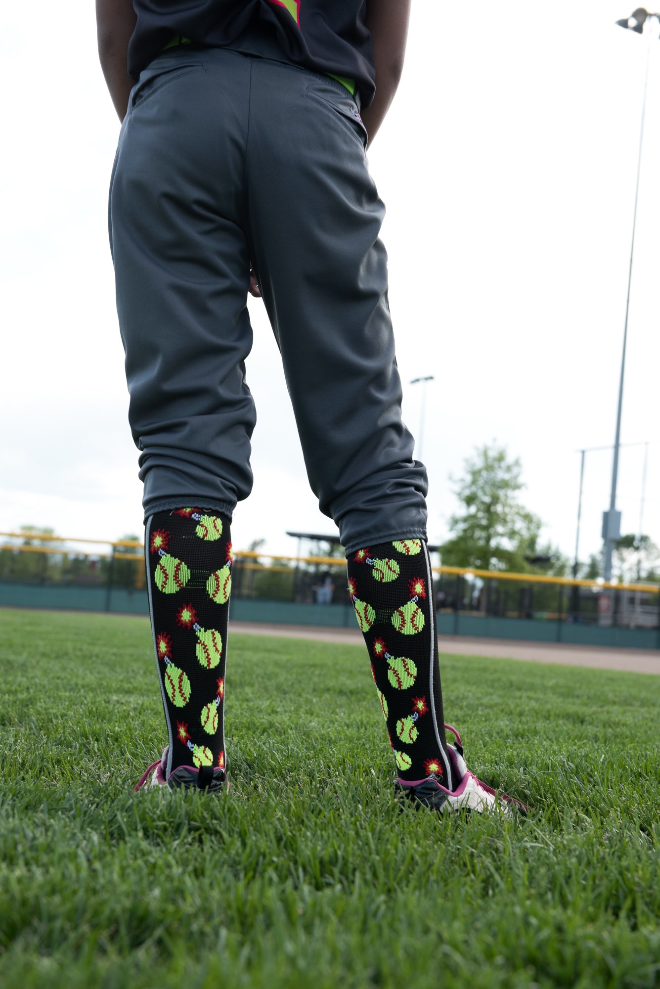 -PERFECT SPORTS SOCKS: These socks have softballs shaped as bombs, lit up, in an over the calf length. Great for teams such as Softball Bombers, Softball Bombs, Firecrackers, or for some super fun, crazy socks to light up the field. Also see our softball bomber headbands.