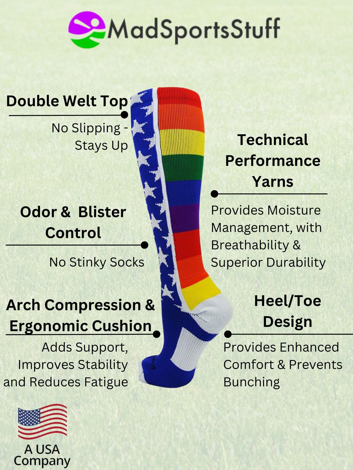 Description MadSportsStuff Rainbow Pride Over the Calf Socks. Product Features - Crew Length, Made in the USA Arch Compression and Heel/Toe Construction, Moisture/Odor Control, Blister Control, Breathable Mesh, Ergonomic Cushioning Fiber Contents: 77% Polypropylene, 17% Nylon, 03% Elastic, 03% Lycra Spandex