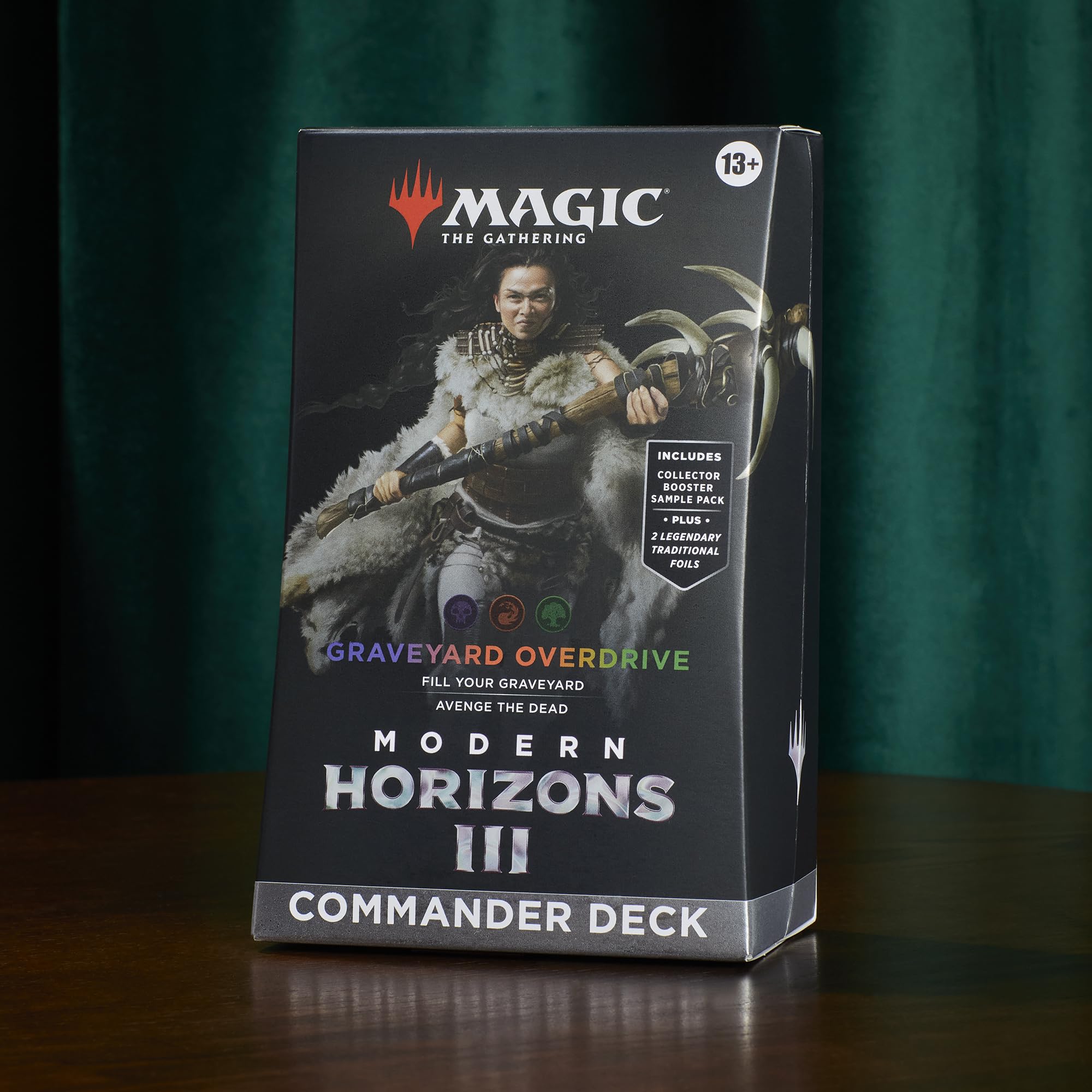 -EVERYTHING YOU NEED FOR EPIC MULTIPLAYER BATTLES—Includes 1 ready-to-play Graveyard Overdrive Modern Horizons 3 Commander Deck, a 2-card Collector Booster Sample Pack, 10 double-sided tokens, 1 life tracker, and 1 deck box