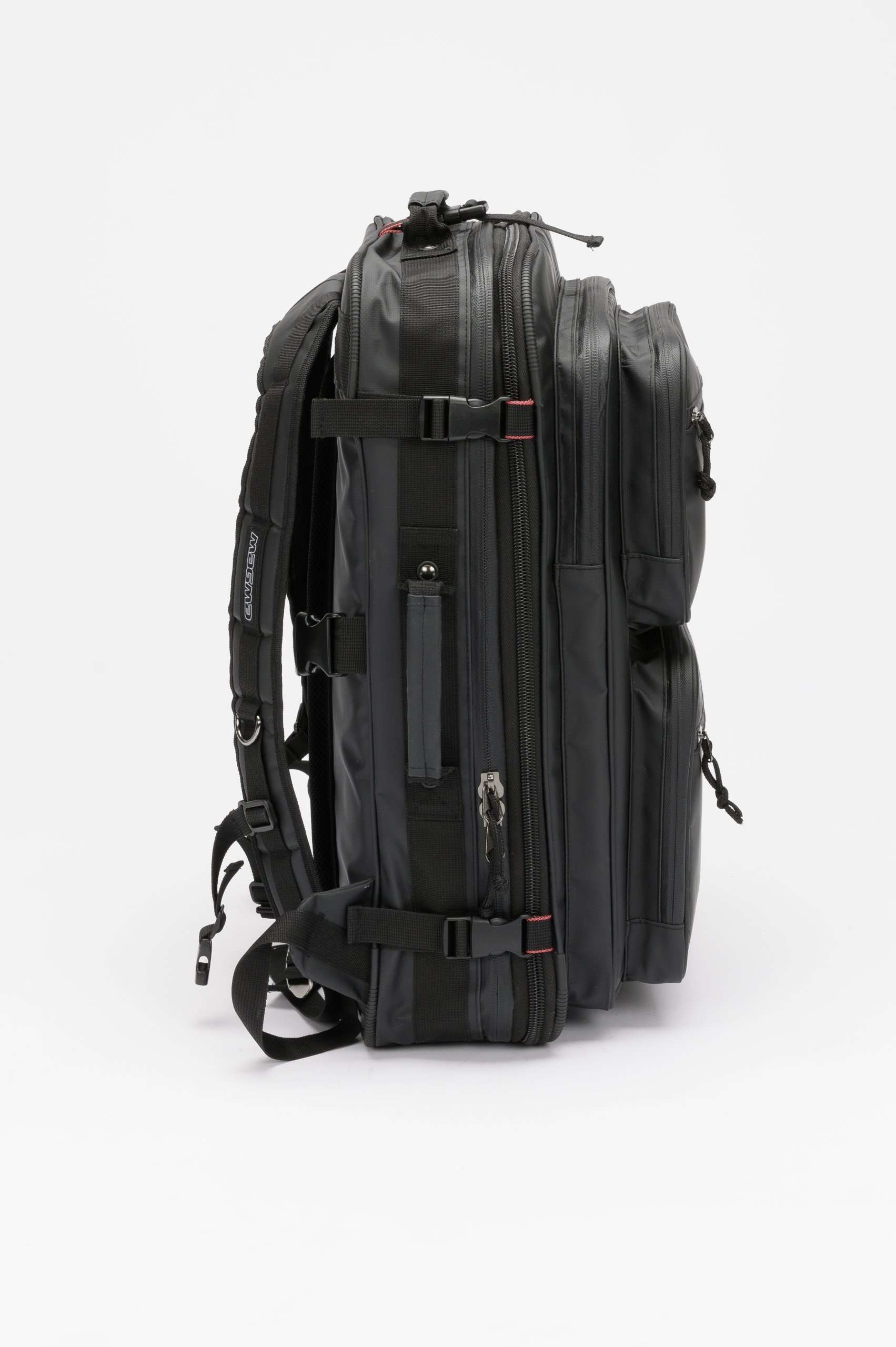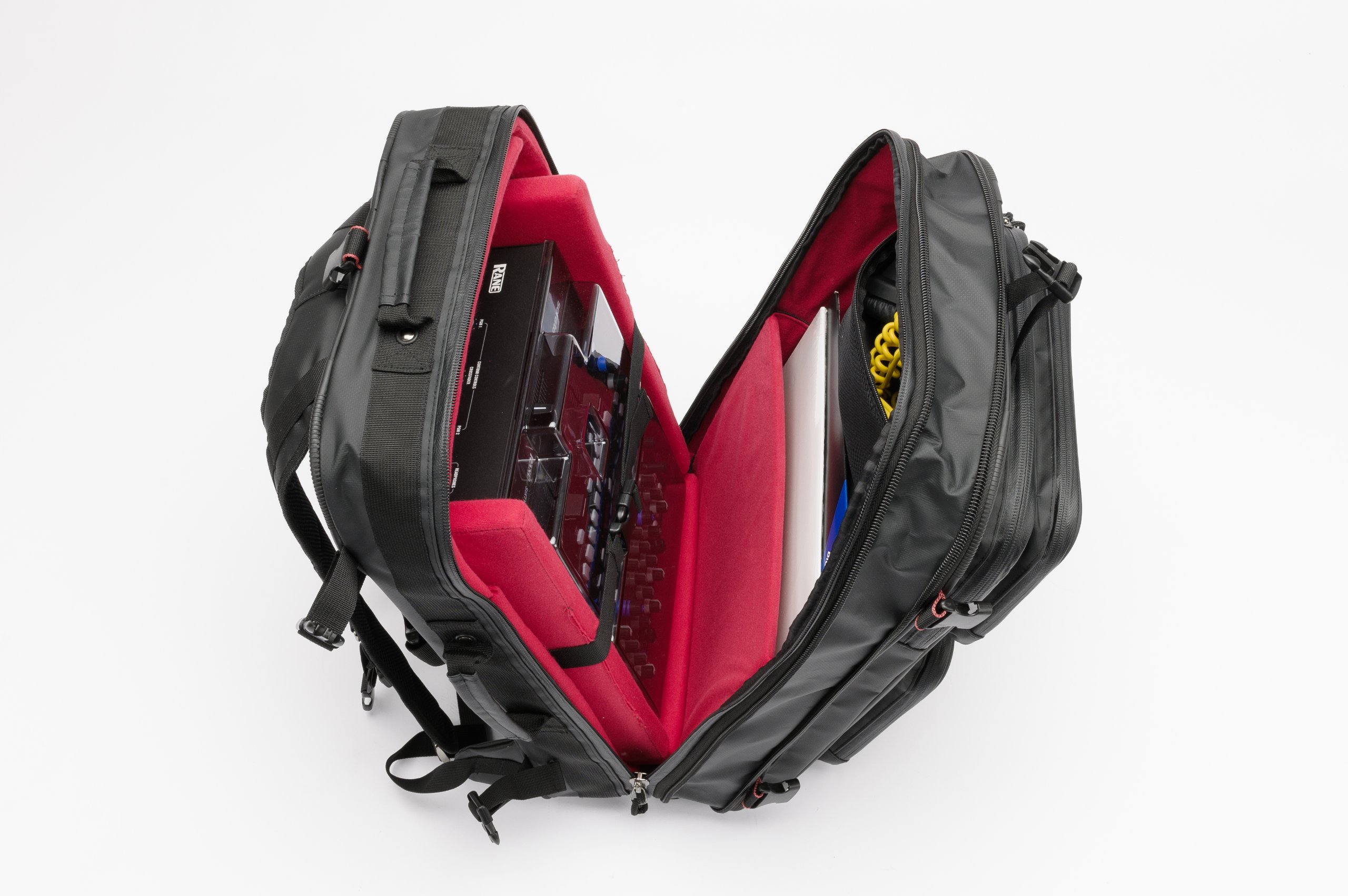 The new Riot DJ Backpack XL is a high-end, extremely rugged backpack designed for the heavy travelling Pro DJ. It comfortably holds any digital gear from Traktor Kontrol S4 and similar sized controllers to battle mixers such as Rane Sixty Two, Pioneer DJM-T1 or Traktor Kontrol Z2, along with a laptop and accessories. Constructed entirely from hardwearing PVC Tarpaulin, its outer shell and all zippers are fully waterproof, which ensures your gear is protected even in the worst weather. Digital DJ's who need to have their gear well organized and protected for their gigs will appreciate the clever interior design and the unique features of the Riot DJ Backpack. The main compartment includes several removable dividers, protection panels and foams which can be adjusted to fit different controller or mixer sizes. The featured Zip-Around Expansion System means the main compartment's capacity can be doubled, turning the Riot DJ Backpack into the ultimate versatile packing monster. This compartment can also be packed and unloaded in two different ways; in the "DJ-booth-friendly" stand-up position and the fully opened and unfolded position to gain easy and complete access. In addition, it is equipped with a separate, padded 17" laptop compartment and two large front pockets with numerous mesh pouches that can store plenty of small items and personal belongings. Ergonomic, s-curved backpack straps and the well-padded cushioning panel provide ultimate carrying comfort.