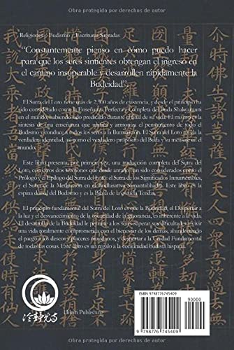 El Sutra del Loto es un sermón dado por el Buda Shakyamuni hace más de 2,500 años, el cual armoniza y unifica todas las enseñanzas dadas por el Buda en sus 40 años de predicación en el mundo y revela el contenido completo de su Iluminación. El Sutra del Loto contiene tres enseñanzas importantes: (1) Siddhartha Gautama, el Buda Shakyamuni, fue un ser mortal y a su vez una manifestación del Buda Eterno. Por ello, el Buda nunca murió, sino que su presencia se extiende a través del tiempo eterno. Así como el Buda se extiende a través del tiempo, igual lo hace su salvación hacia todos los seres. (2) La salvación (el Despertar) es para todos los seres, incluyendo las mujeres y los seres malvados, a quienes se le había negado la posibilidad de alcanzar la Iluminación en sermones anteriores. (3) El Sutra del Loto abarca todas las enseñanzas y prácticas budistas bajo el Vehículo Único (Ekayana), siendo todos medios válidos para alcanzar el Despertar. Esto hace que el mensaje del Sutra del Loto sea eterno, universal y abarcador. Es por esto que es la enseñanza máxima del Buda en el mundo. Este libro es una traducción completa al español del Sutra del Loto, junto con sus dos Sutras de Apertura y Cierre: el Sutra de los Significados Innumerables, y el Sutra de la Meditación en el Bodhisattva Samantabhadra.