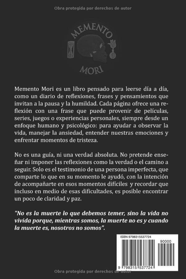 Un libro de reflexiones para momentos difíciles, En algún punto de la vida, todos atravesamos ansiedad, dolor, pérdida o confusión. Hay días en los que no buscamos respuestas complejas ni grandes explicaciones, sino una pausa, un respiro, una idea sencilla o una frase honesta que nos ayude a sostener el momento y seguir adelante. Memento Mori – Recuerda tu muerte es un libro de reflexiones personales de peliculas, juegos y series, escrito desde la experiencia humana de alguien imperfecto, no desde una postura filosófica, académica o espiritual, ni con la intención de ser una guía de vida. No busca enseñar, dirigir ni decirte qué hacer. No soy un maestro ni alguien a quien seguir, el libro nace desde la imperfección de alguien que también se equivoca, duda y atraviesa momentos difíciles. Su propósito no es dar respuestas definitivas, sino acompañar. Ofrecer palabras que puedan servir como apoyo emocional en instantes de ansiedad, cansancio o cuando lo único necesario es sentir que no se está solo. El título Memento Mori es una expresión latina que recuerda la fragilidad de la vida y su carácter finito. A lo largo de estas páginas, esa idea se convierte en una invitación a vivir con mayor conciencia, humildad y responsabilidad, valorando el presente y reconociendo que incluso en medio del dolor es posible dar un paso más. Este libro no pretende reemplazar la ayuda profesional ni la ayuda espiritual. La terapia y la fe —en especial la Biblia, entendida aquí como un libro sagrado— ocupan un lugar distinto y profundo en la vida de muchas personas. Este libro no busca sustituiarlas. Cada reflexión puede leerse de manera independiente, como una pausa diaria para ordenar pensamientos, respirar con mayor claridad y encontrar un poco de calma en medio del ruido. Si te has sentido agotado emocionalmente o abrumado por la vida este libro puede ser un espacio tranquilo para simplemente tener una pausa. No promete soluciones rápidas, pero sí palabras honestas que buscan estar presentes. Memento Mori es una invitación a vivir con más conciencia hoy, recordando que la vida es frágil, valiosa y finita… y que un problema no es el final del camino. Atte. Humberto Montesinos