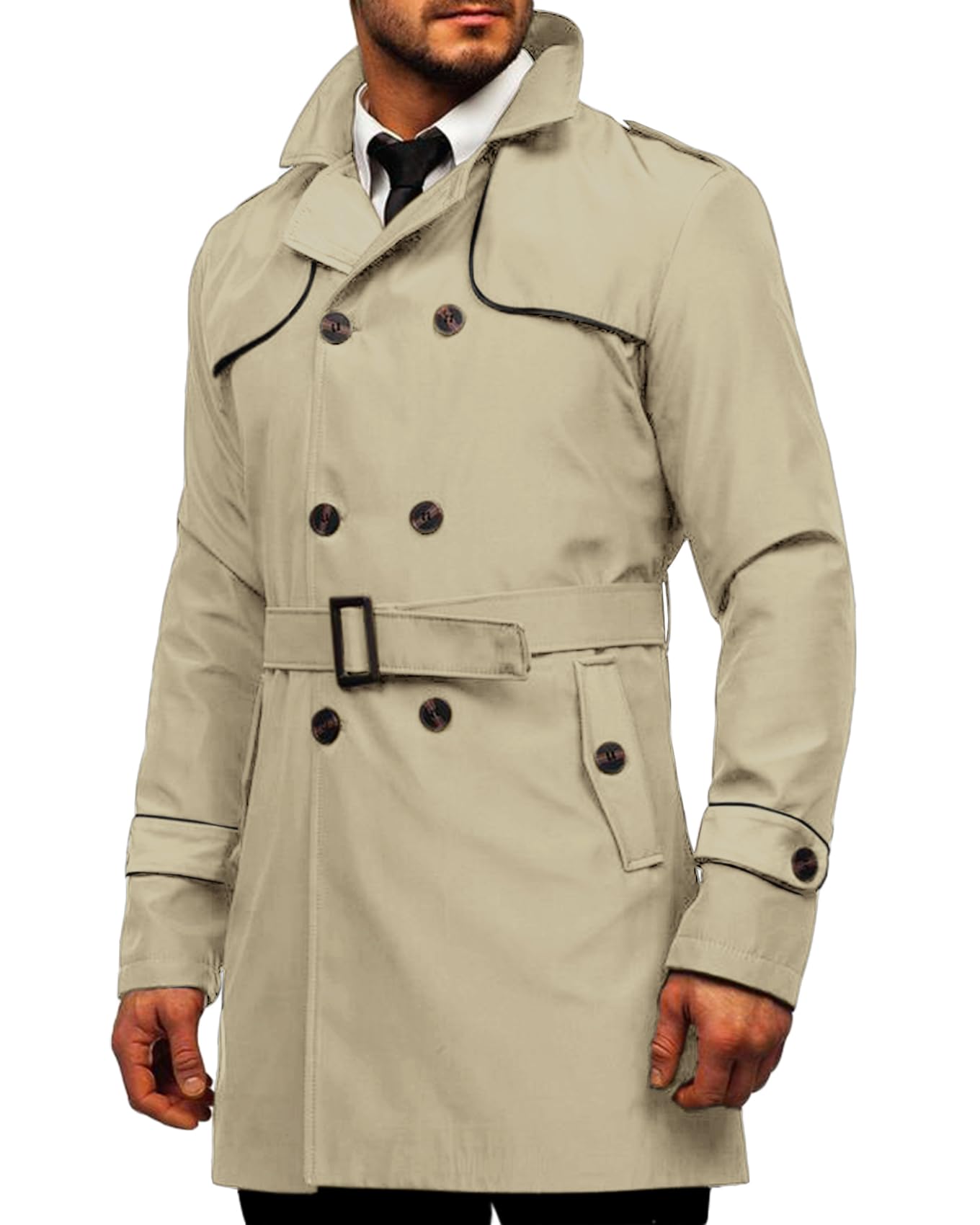-Features: Men's mid-length windbreaker, the double-breasted design is classic and retro, the belt is beautiful and practical, the edge strips are embellished with a full sense of design, and the shoulder straps and cuffs are full of details. Two welt pockets at waist height can easily store small items such as earphones, wallet, keys and keep your hands warm.