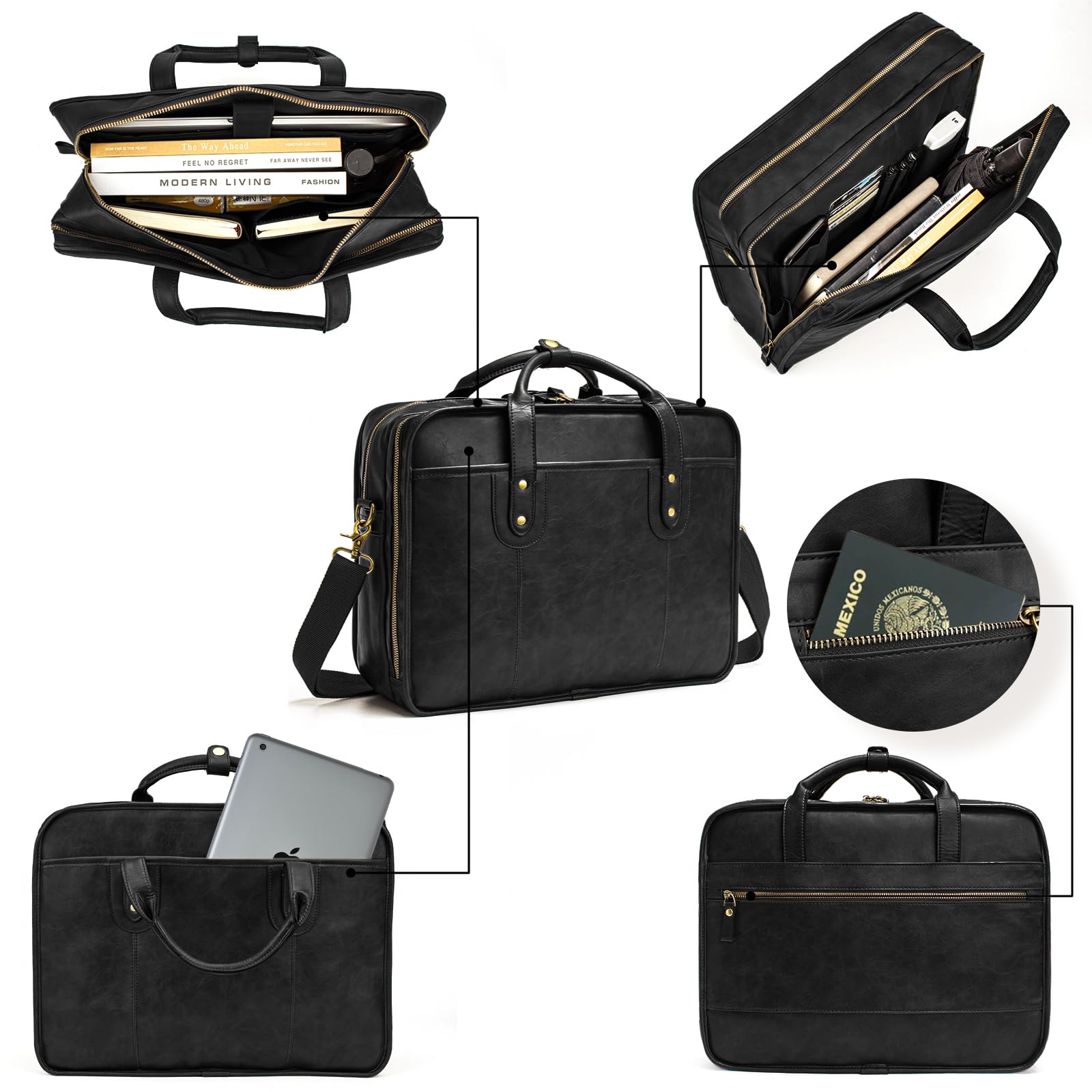 -Multi-Functional Compartments : This vintage briefcases for men is well-designed and Huge-roomy, it has enough capacity with 4 compartments to hold daily essentials. 1*Main compartment can hold a 15.6 inch laptop and some books, 1*document organizer compartment, 1* front compartment with buttons pocket and 1*back zipper pocket can hold your iPhone, iPad, passport, file, credit cards, ID card , pen, wallet, keys and other all your items. Multi-layered space design, convenient and practical.