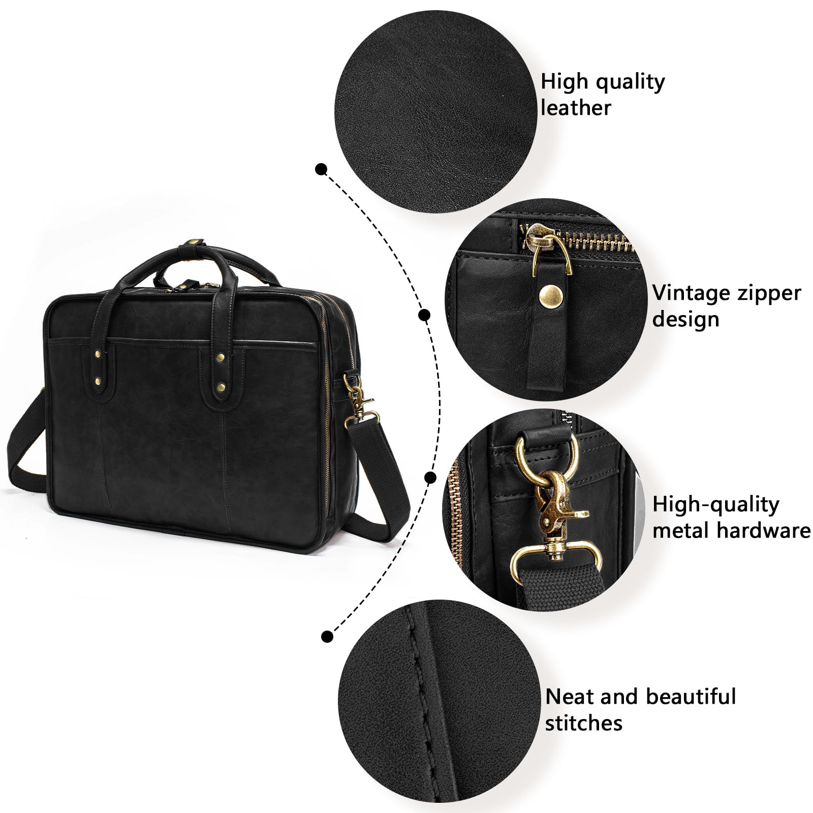 -Premium Material & Water Resistance : The laptop briefcases for men is made of high-quality leather. Features a dual compartment top metal zip and durable metal hook of strap to ensure long lasting durability.The surface of the briefcase is smooth and beautiful, with abrasion resistance and water resistance. The brown leather fabric shows a retro and wild style.