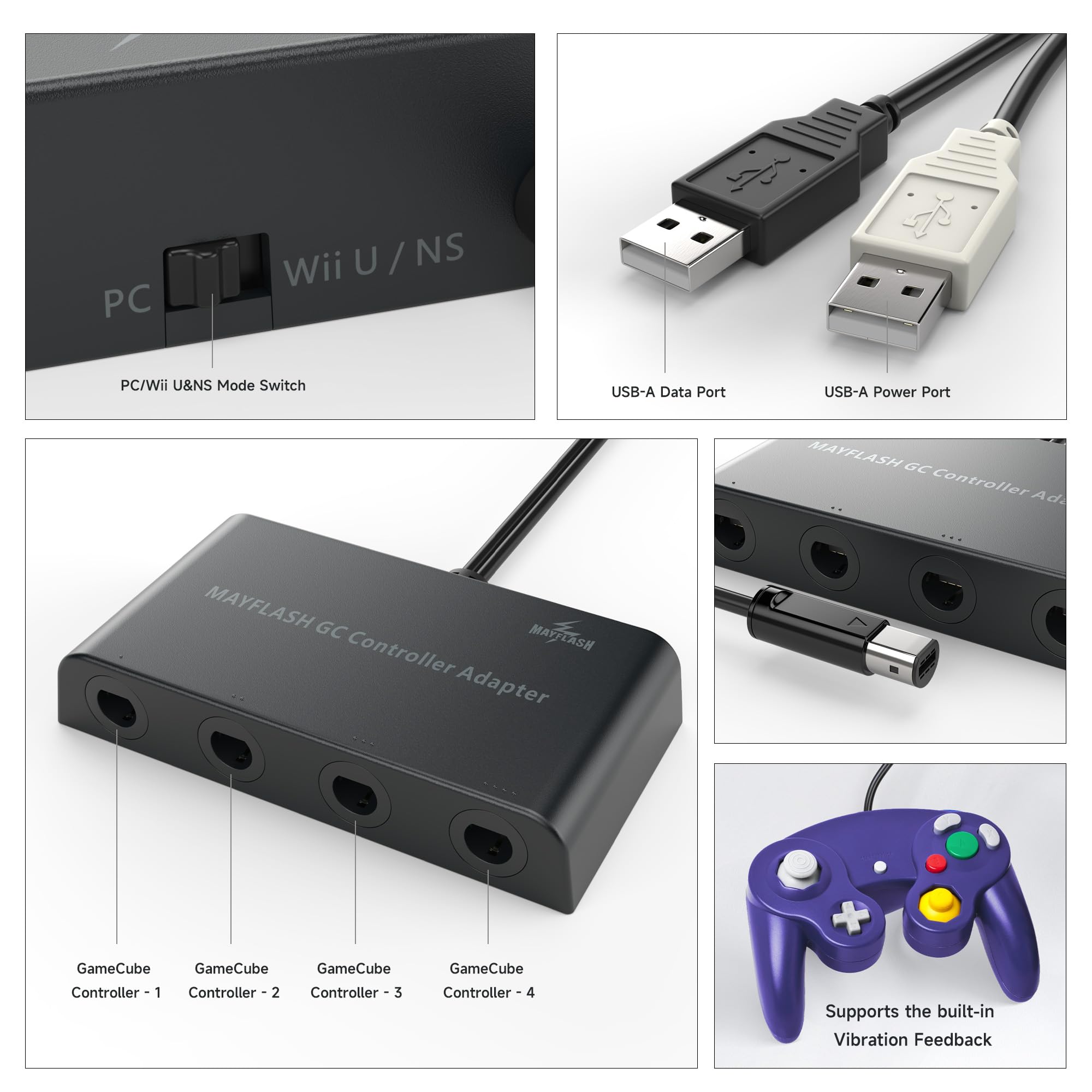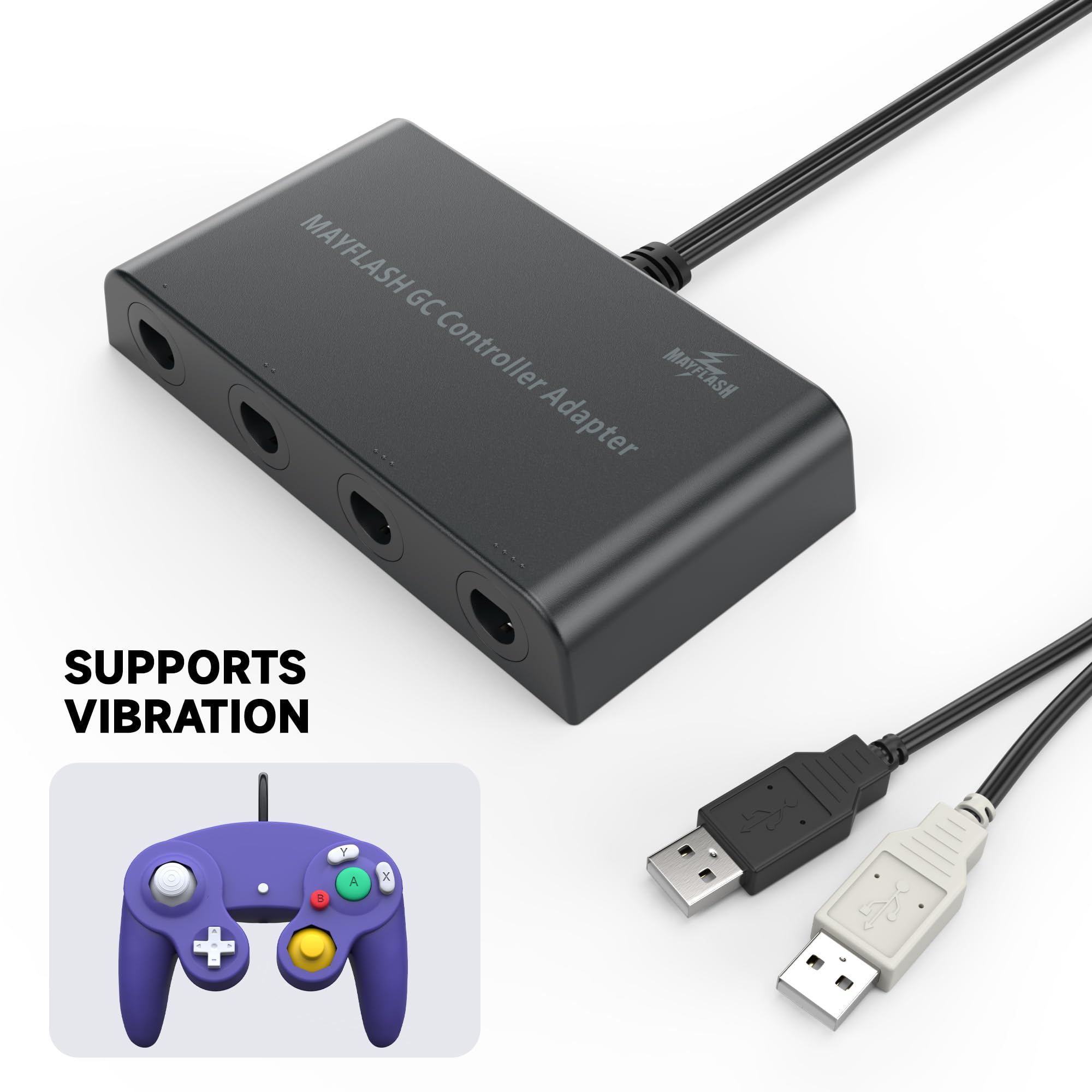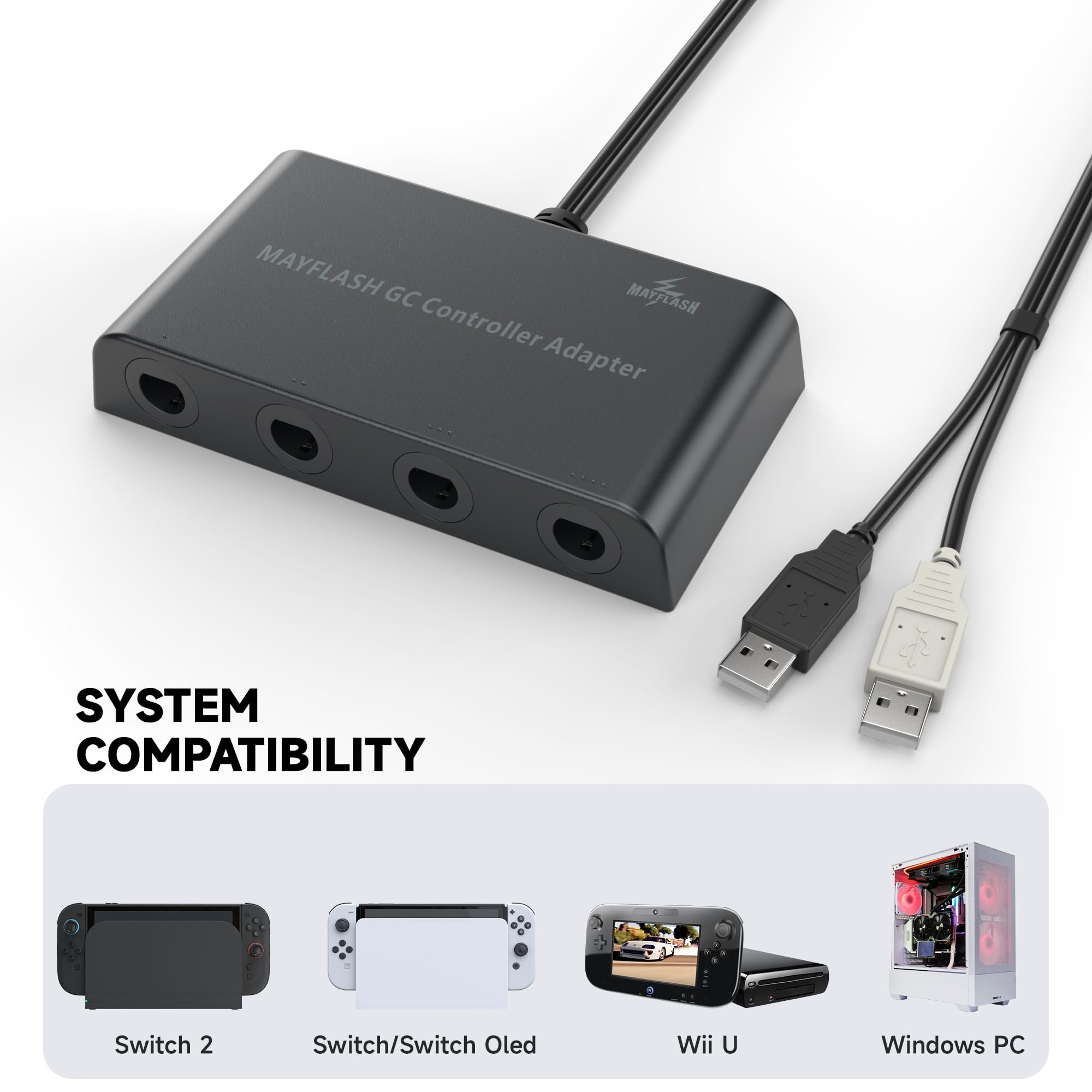 -The GameCube Controller Adapter allows you to connect up to four GameCube controllers (or wireless GameCube controllers) to a Wii U system, PC USB, Switch/Switch 2.