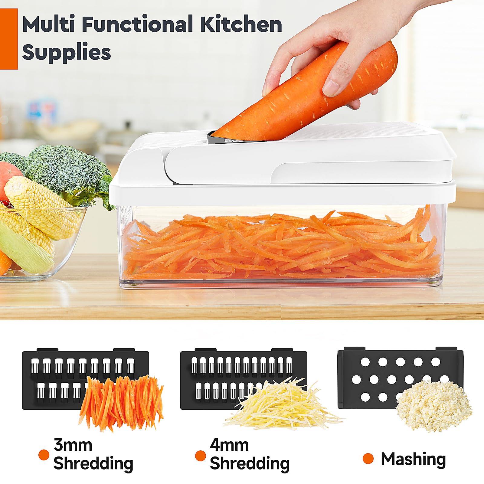 -[Efficient kitchen essentials] If you use a kitchen knife to slice or shred fruits and vegetables, it takes considerable time and effort, but using our multifunctional veggie chopper can process vegetables into the shape you want faster. MealHelper veggie chopper uses stainless steel blades which are sharp enough. You can easily slice, chunk, or shred, and you can choose different sizes of blades to process ingredients according to your cooking needs. By using our MealHelper veggie chopper, you can chop vegetables more quickly!