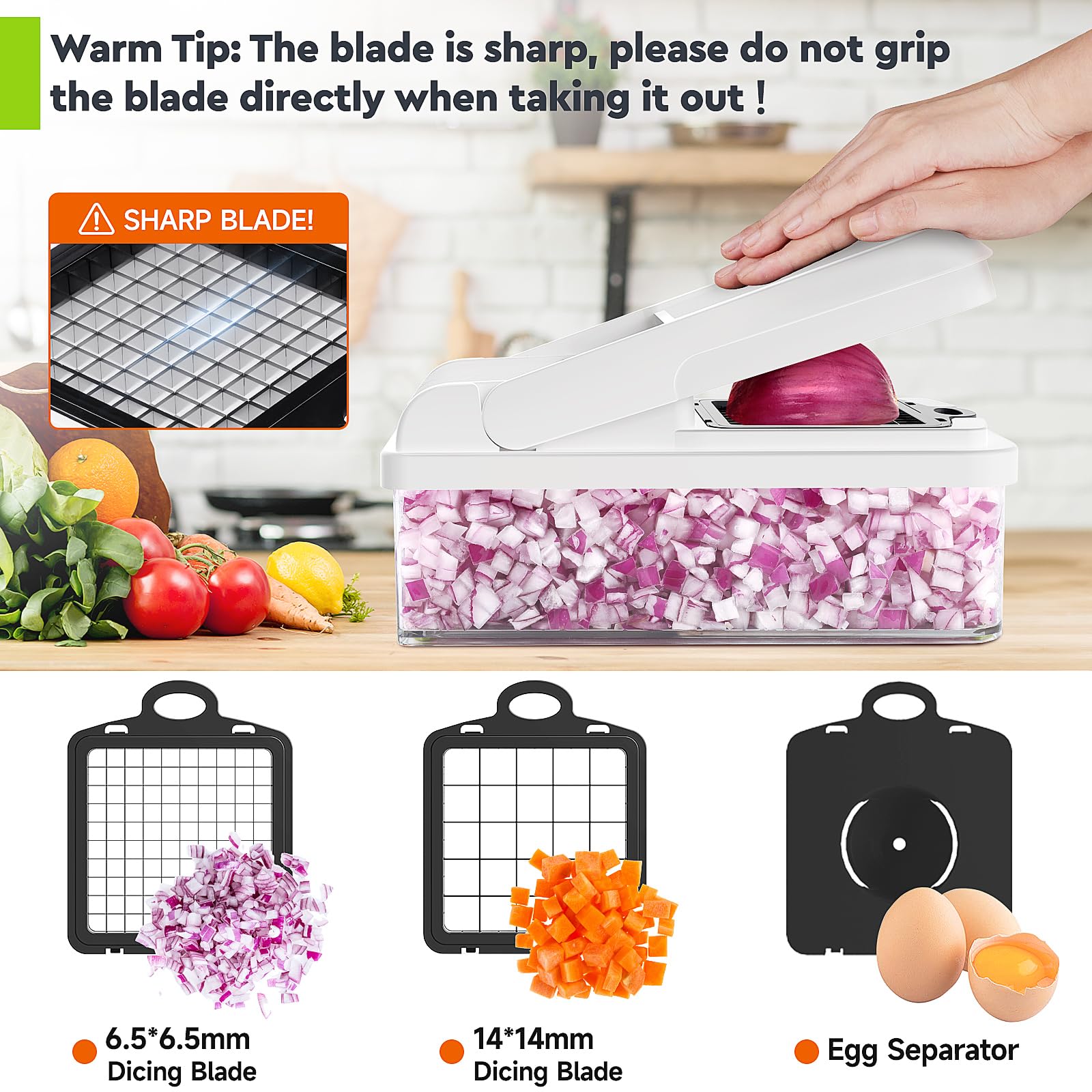 -[Meets various needs] The chopper contains 7 types of blade meet all of your slicing, chunking, and shredding needs. The set also includes an egg white separator, a hand protector, a cleaning scraper, and a cleaning brush. You can easily separate egg whites from egg yolks and the hand protector can better prevent injuries when handling ingredients. The instructions included in the set can help you become proficient in using MealHelper vegetable chopper.
