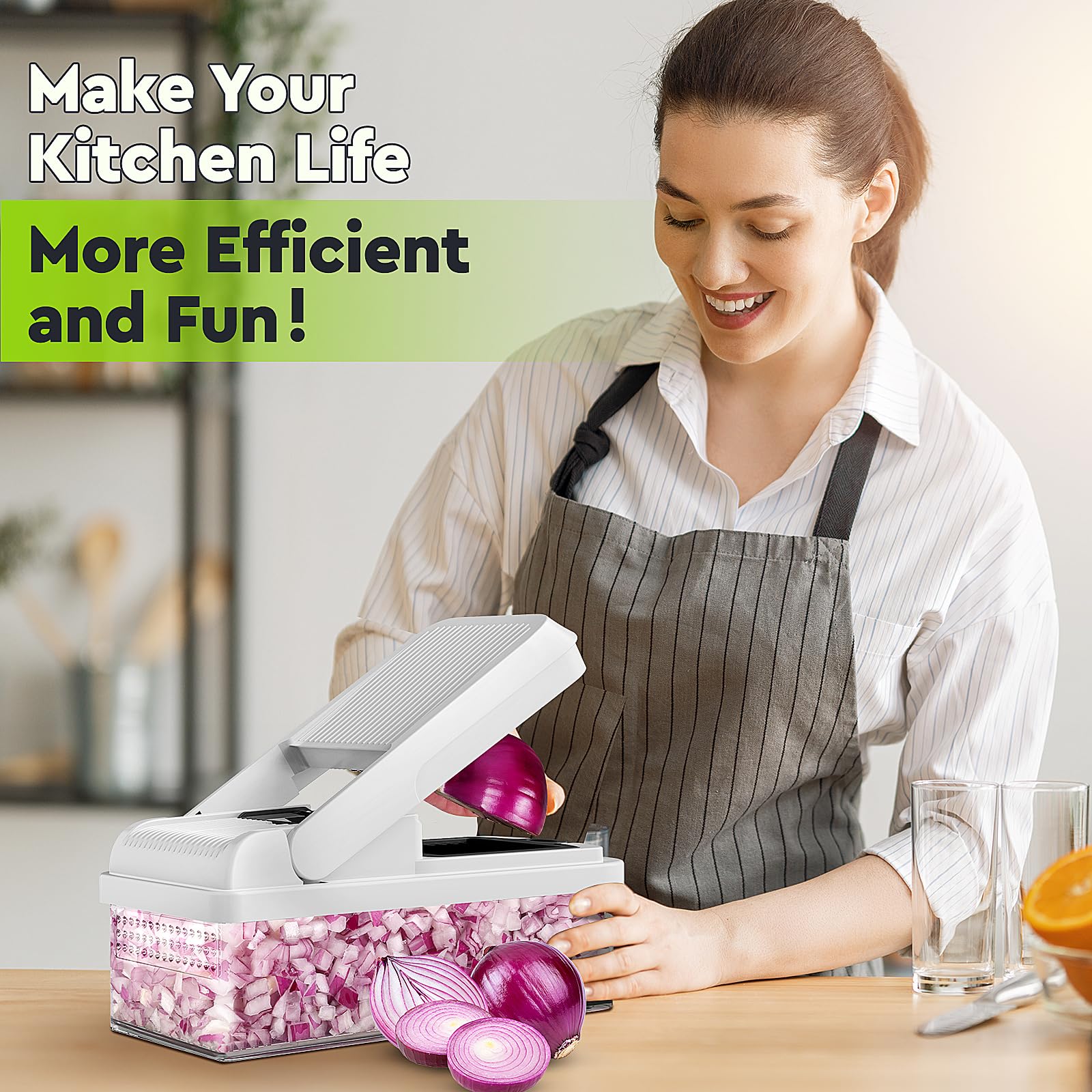 MealHelper Picadora de verduras 12 en 1, picadora de verduras de 7 hojas, práctica picadora de alimentos con recipiente, rallador de queso, artículos esenciales para el hogar y utensilios de cocina (negro/blanco)