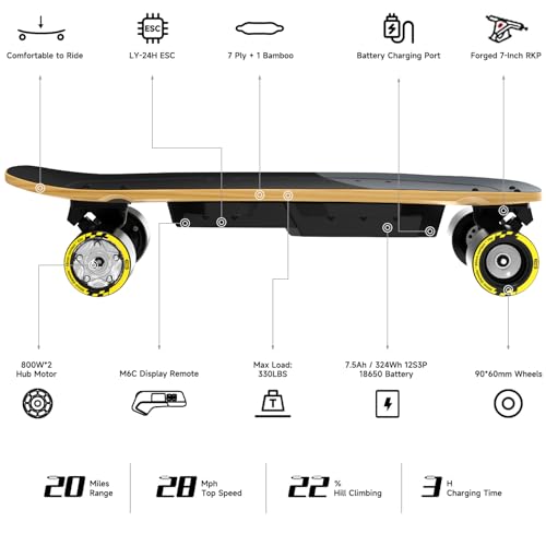 -Dual 800W Motors, Unleashed Speed——Feel the thrill of 28 MPH (45 KPH) top speed with dual hub motors and conquer up to 30% hill grades with ease. Small board, unstoppable force