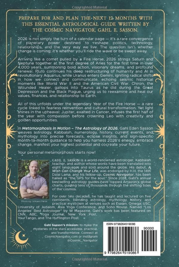 2026 isn’t just another year - it’s a rare convergence of planetary power. Saturn–Neptune at 0° Aries initiates a karmic reset; Pluto in Aquarius rewires technology, community, and power; Uranus entering Gemini revolutionizes communication; Jupiter moves from healing Cancer to creative Leo, amplifying “golden” opportunities. All of this unfolds inside the legendary Year of the Fire Horse—bold, fast, transformational. The book includes a link and QR code for a free download of the Cosmic Navigator 2026 Calendar with all the critical astrological dates and their meaning - from eclipses to retrogrades, significant transits, and planetary aspects, so that you can be better prepared for the turbulent year ahead. Metamorphosis in Motion: The Astrology of 2026 is your practical year‑ahead roadmap—part horoscope guide, part planner workbook. Inside, you’ll find a complete lunar calendar (new/full moons, four eclipse dates, timing for intentions), clear Mercury‑retrograde guidance, and month‑by‑month strategies for every sign. The method blends Astrology with Kabbalah, Numerology, myth, and history to turn uncertainty into momentum—one lunation at a time. Read for your Sun and your Rising sign to personalize the forecast. What you’ll get: Yearly Horoscope & Zodiac Predictions for Every Sign — month‑by‑month guidance you can act on (love, career, money, health), plus key dates to plan launches, conversations, and creative sprints. Access to Free Astro Calendar — The astrologically significant dates and their interpretation provided as a link and QR code for free download to your favorite calendar (Google, Apple, Yahoo, Outlook etc.) Lunar Calendar & Moon Phases — every New/Full Moon for 2026 with intention prompts, timing for rituals, and eclipse specifics so you “work the plan” with the Moon. All 2026 Eclipses at a Glance — Aquarius (annular solar, Feb 17), Virgo (total lunar, Mar 2–3), Leo (total solar, Aug 12), Pisces (partial lunar, Aug 27–28), with practical takeaways. Retrogrades Made Simple — exact 2026 timing highlights and checklists (especially Mercury) so you can plan—not panic. Big Transits, Plain Language — Saturn–Neptune at 0° Aries; Uranus in Gemini; Pluto in Aquarius; Jupiter in Cancer → Leo; Nodes/eclipse axis shift—what they mean and how to use them. Manifestation & Planning Tools — intention frameworks tied to lunations and practical timing windows for results you can measure. For Beginners and Pros — accessible explanations with real depth; read for Sun and Rising to personalize your roadmap. Read the sky. Work the plan. Start your metamorphosis and make 2026 the best year!