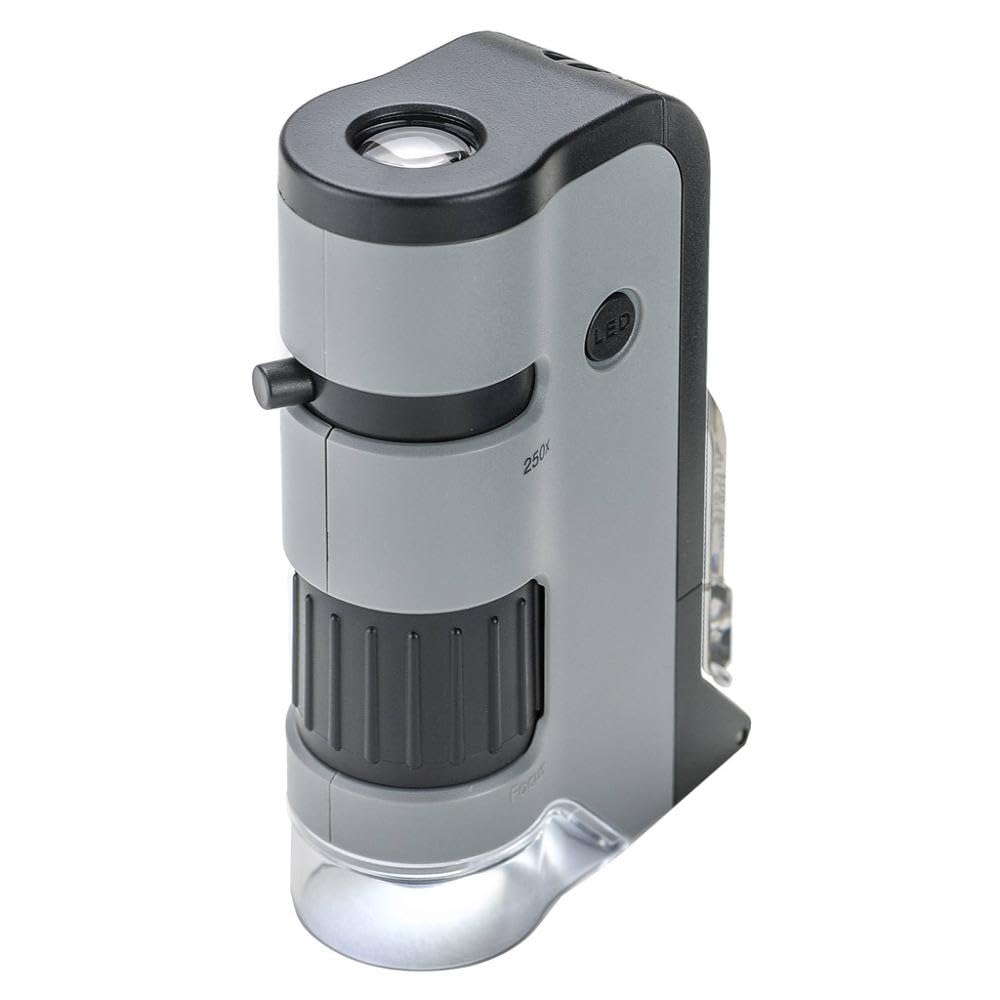 Carson MicroFlip 100x-250x, microscopio de bolsillo LED UV con clip para teléfono inteligente, educación STEM (MP-250)