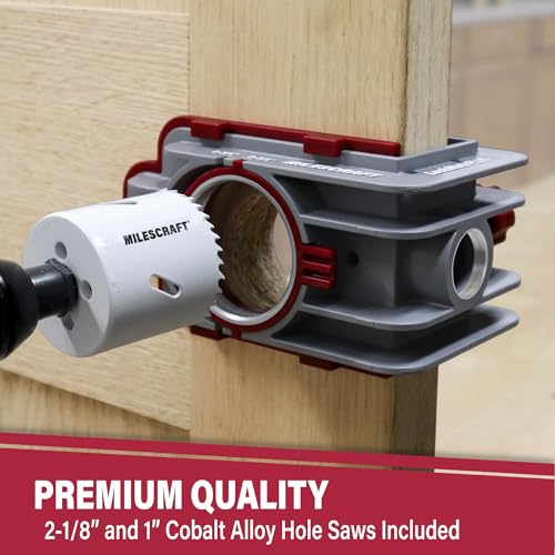 Milescraft 1338 Lock Mate PLUS: kit de instalación de cerradura de puerta profesional con autosujeción, plantilla de cerradura de puerta para puertas de madera/metal con 1-3/8” y 1-3/4” de espesor. Sierras perforadoras bimetálicas de cobalto incluidas