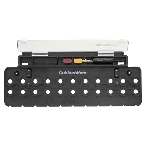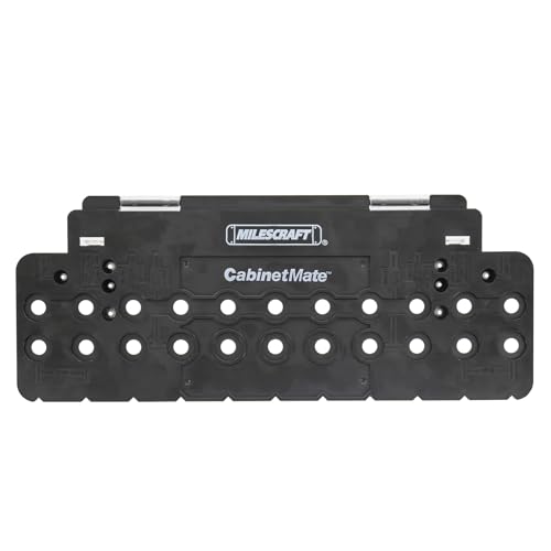 Create sturdy, true cabinet shelfing with the Milescraft® CabinetMate. This light-weight, easy to use jig allows you to drill up to eleven holes evenly spaced 32mm a part in one setting. Whether creating cabinets from scratch or updating existing cabinets, this jig helps you get the job done fast and accurately. The jig is designed for use with both face-frame and frameless cabinets. The CabinetMate shelf pin jig has a rigid main body, indexing pins, and a self-centering, spring-loaded drill bit. The custom spring-loaded-brad point drill bit allows the holes you drill to self-center with the holes on the main body. This bit is pre-set to bore a crisp hole with consistent depth for a perfect fitting shelf pin. The CabinetMate also comes with a built-in closed storage compartment for your bit and indexing pins. The CabinetMate allows you to accurately drill eleven holes, evenly spaced at 32mm apart, in just one setting. This innovative tool can be used on cabinet sides before assembly, already assembled cabinets and face-frame or frameless cabinets. A stand-out feature of the CabinetMate is that it also allows you to mark the locations for Euro-style hinges. This tool comes with the 1/4″ self-centering drill bit. If you are looking for a very affordable, high quality and extremely versatile cabinet jig, the new Milescraft CabinetMate is the only one you will need to look at.
