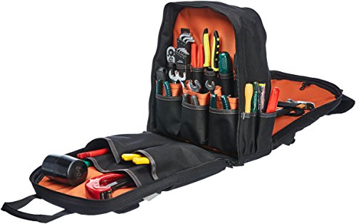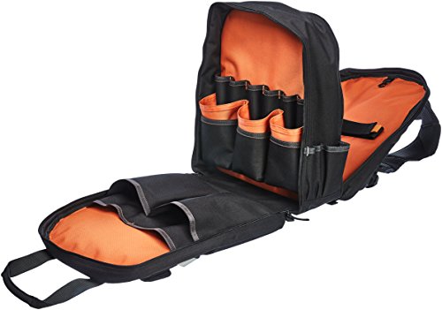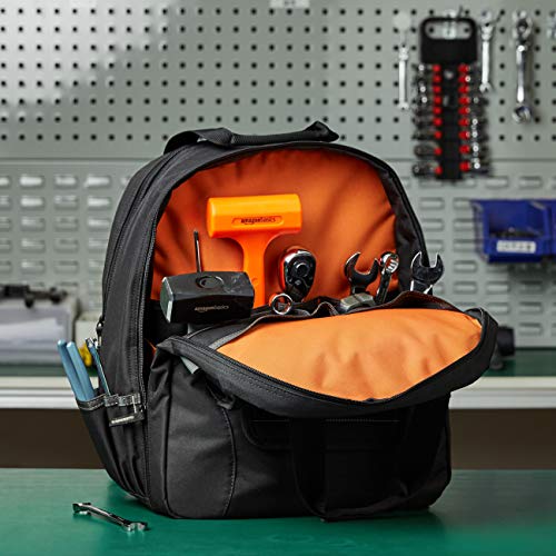 - Make sure this fitsby entering your model number. - 100% Polyester - Imported - Tool bag backpack with 42 inside pockets and 9 outside pockets for easy organizing and transport - Large easy-access pocket on top; 2 main zippered compartments: 1 for tools and parts, 1 for a cordless drill and battery - Made of durable 600D x 600D polyester fabric with a PVC-coated 600D polyester interior lining for added strength - Comfortable padded back support and shoulder straps with adjustable chest strap; orange interior for finding items easily - Backed by an Amazon Basics limited 1-year warranty Style:51-pocket With Adjustable Front PouchAn Amazon Brand