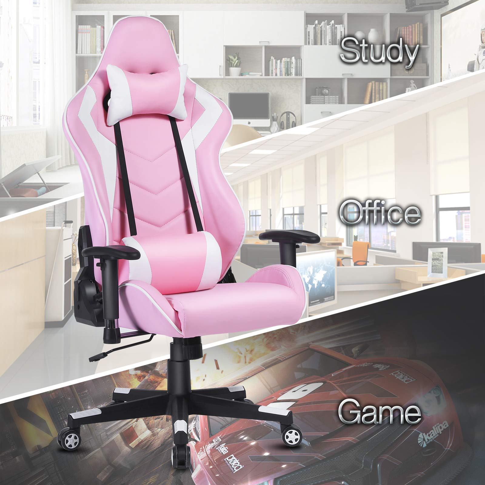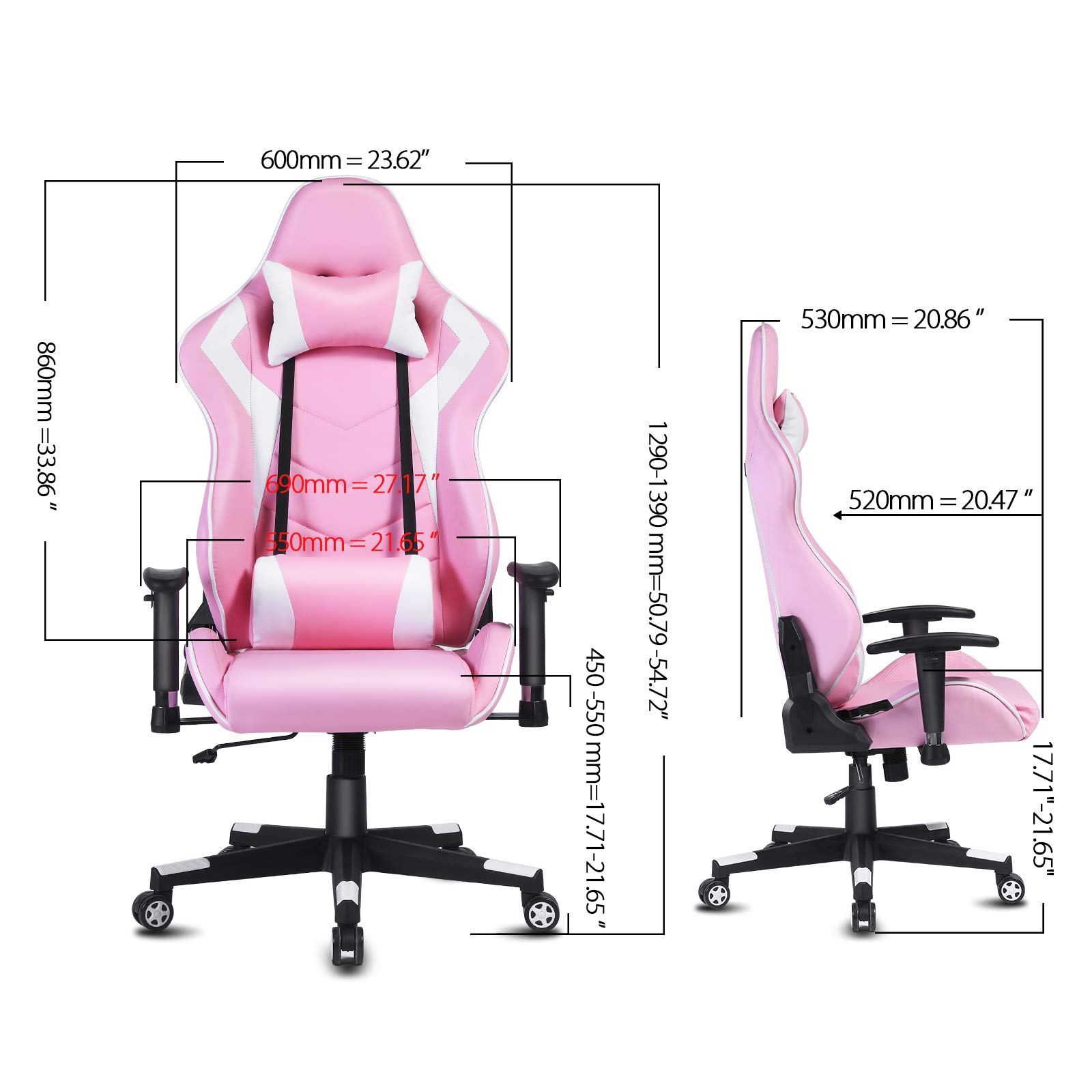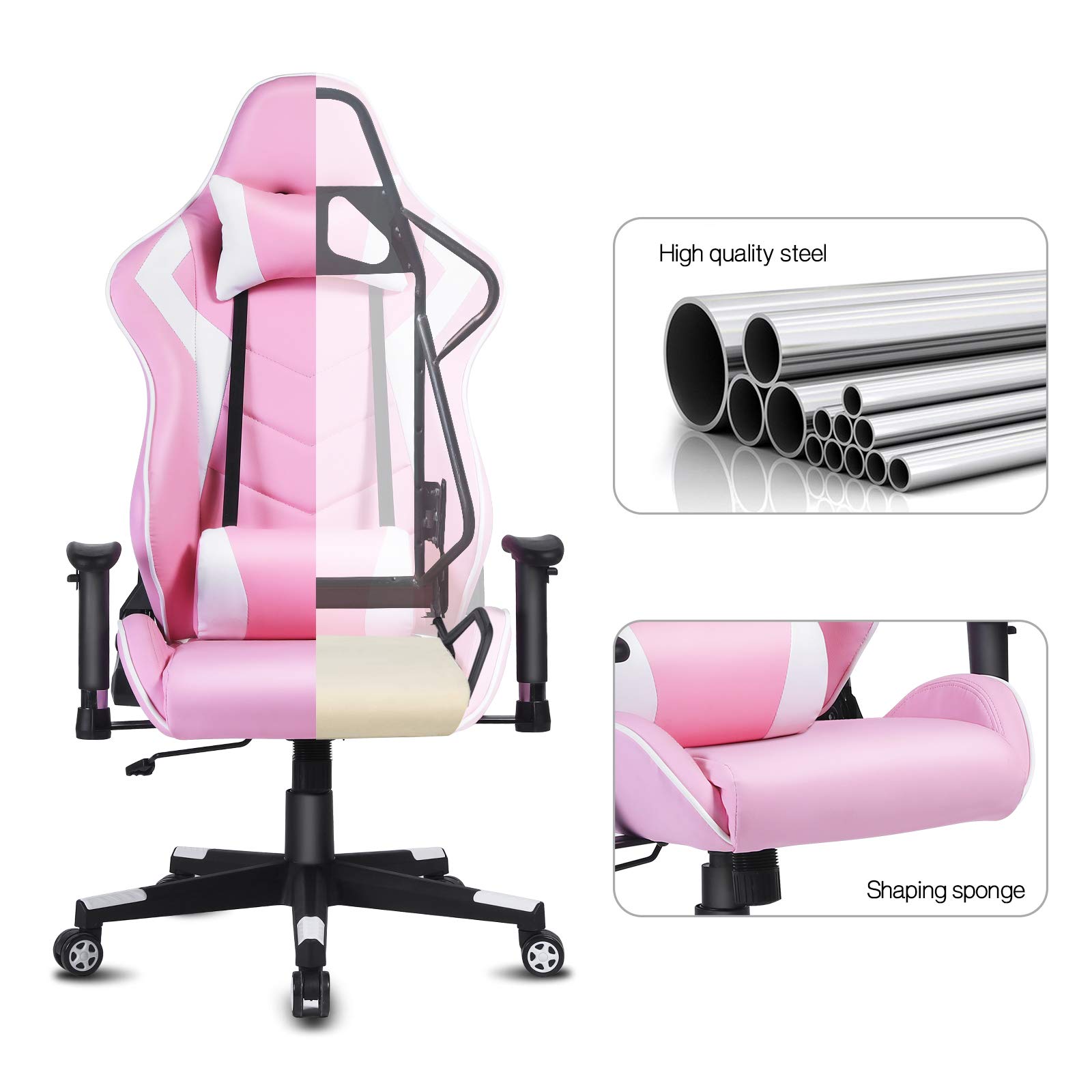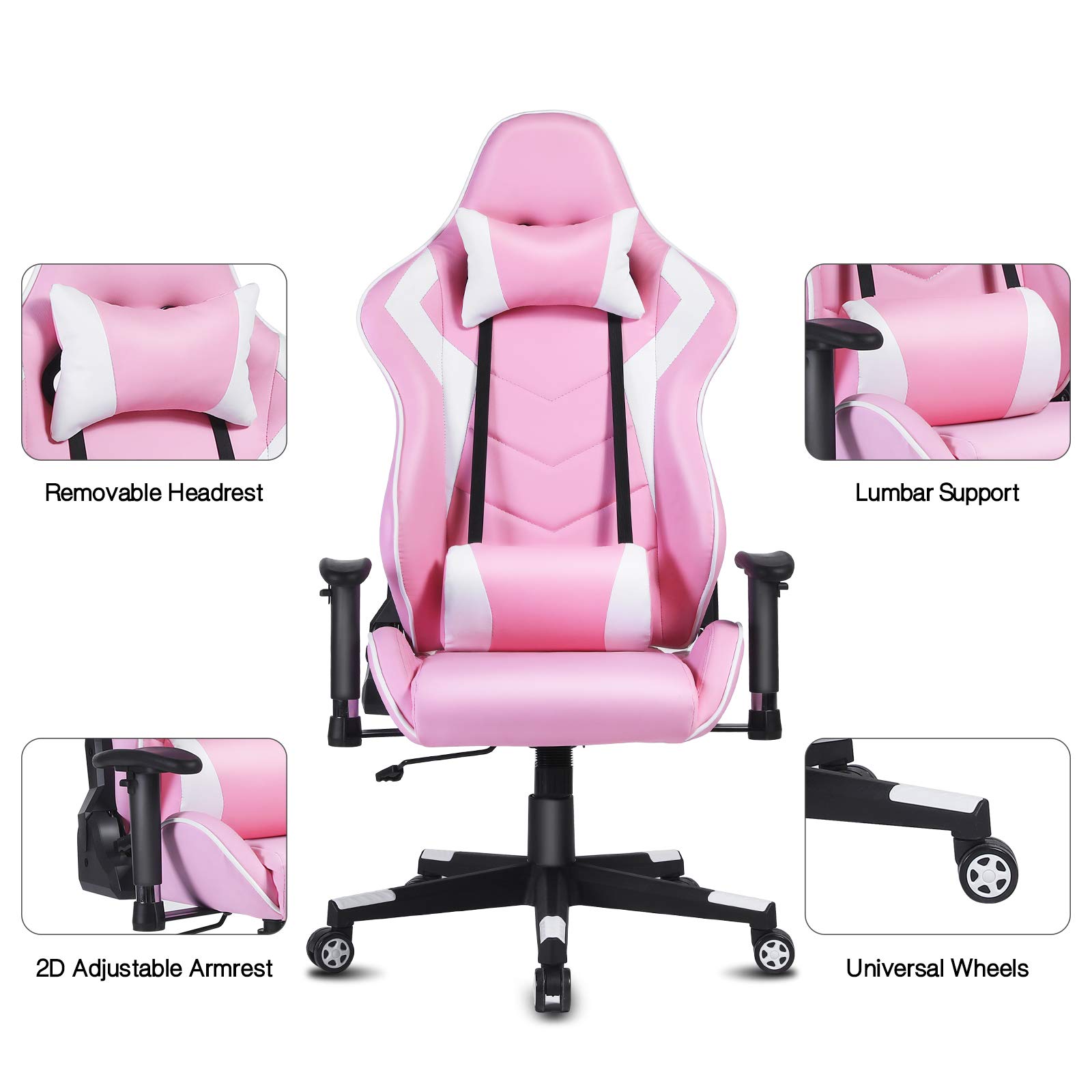 Silla giratoria para juegos con respaldo alto, reclinable, estilo de carreras, ergonómica, escritorio de oficina, silla reclinable con reposacabezas y soporte lumbar, rosa y blanco