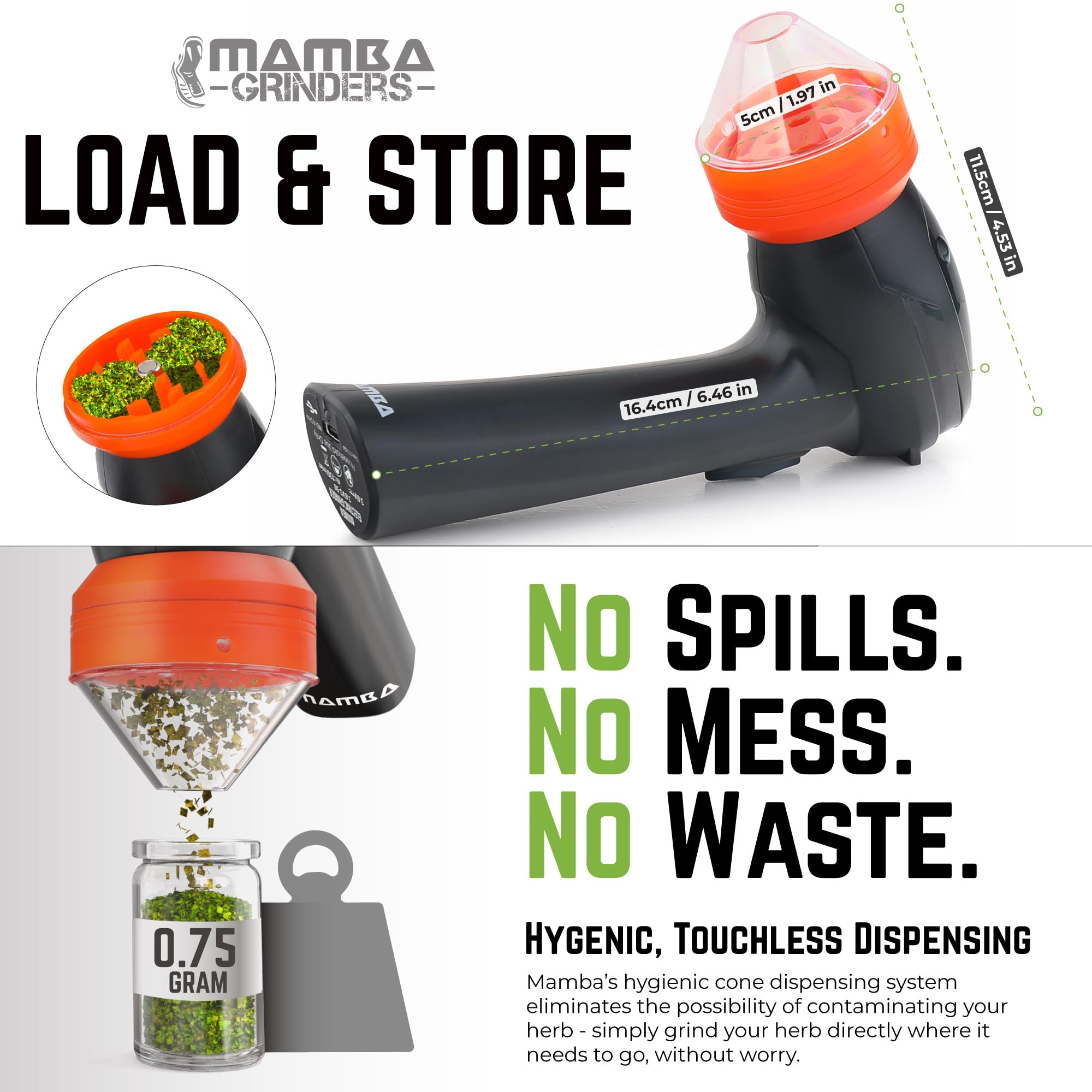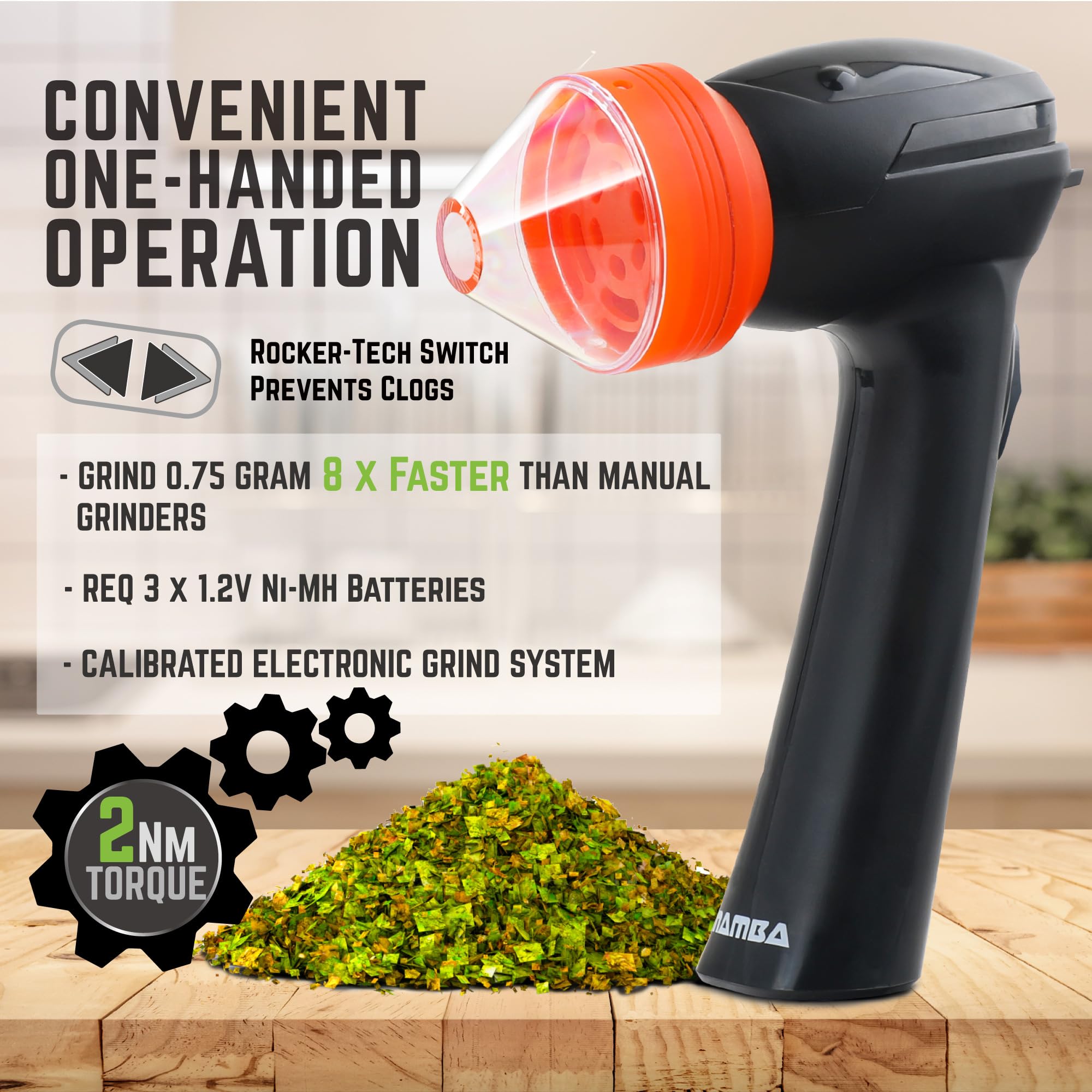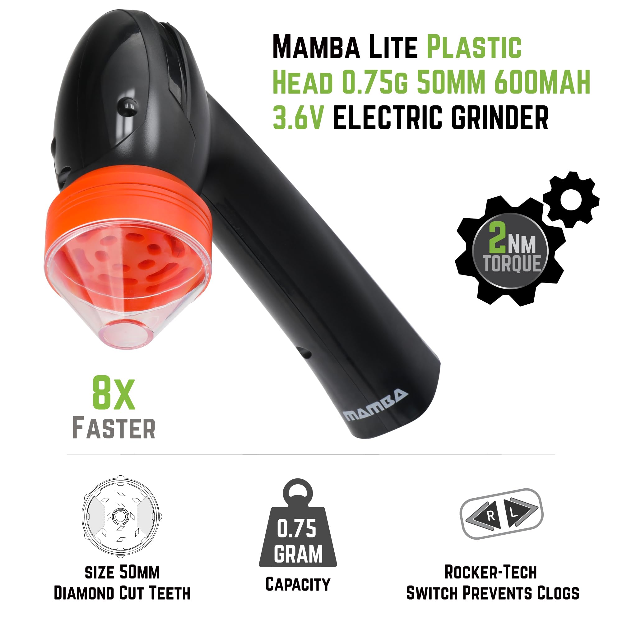 Molinillo de hierbas eléctrico USB con cabezal de plástico naranja Mamba Lite de 0,75 g. Pequeña máquina de hierbas portátil y molinillo de especias para la cocina