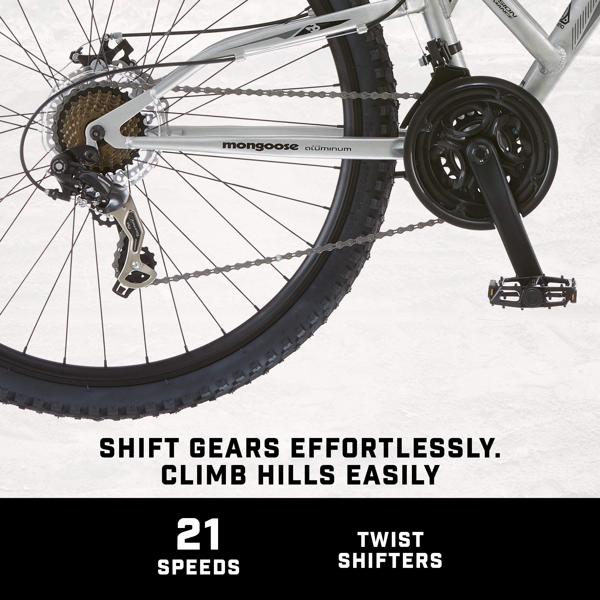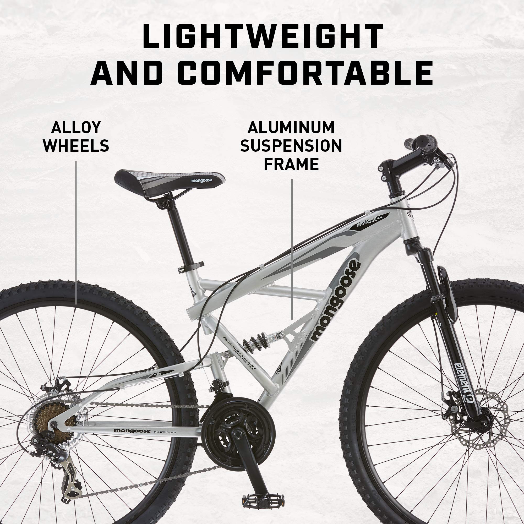 Mongoose Impasse Bicicleta de montaña con suspensión total, para hombres y mujeres, cuadro de aluminio de 18 pulgadas, ruedas de 29 pulgadas, frenos de disco delanteros y traseros, palancas de cambio giratorias, desviador trasero de 21 velocidades, platea