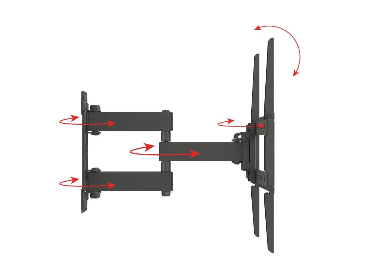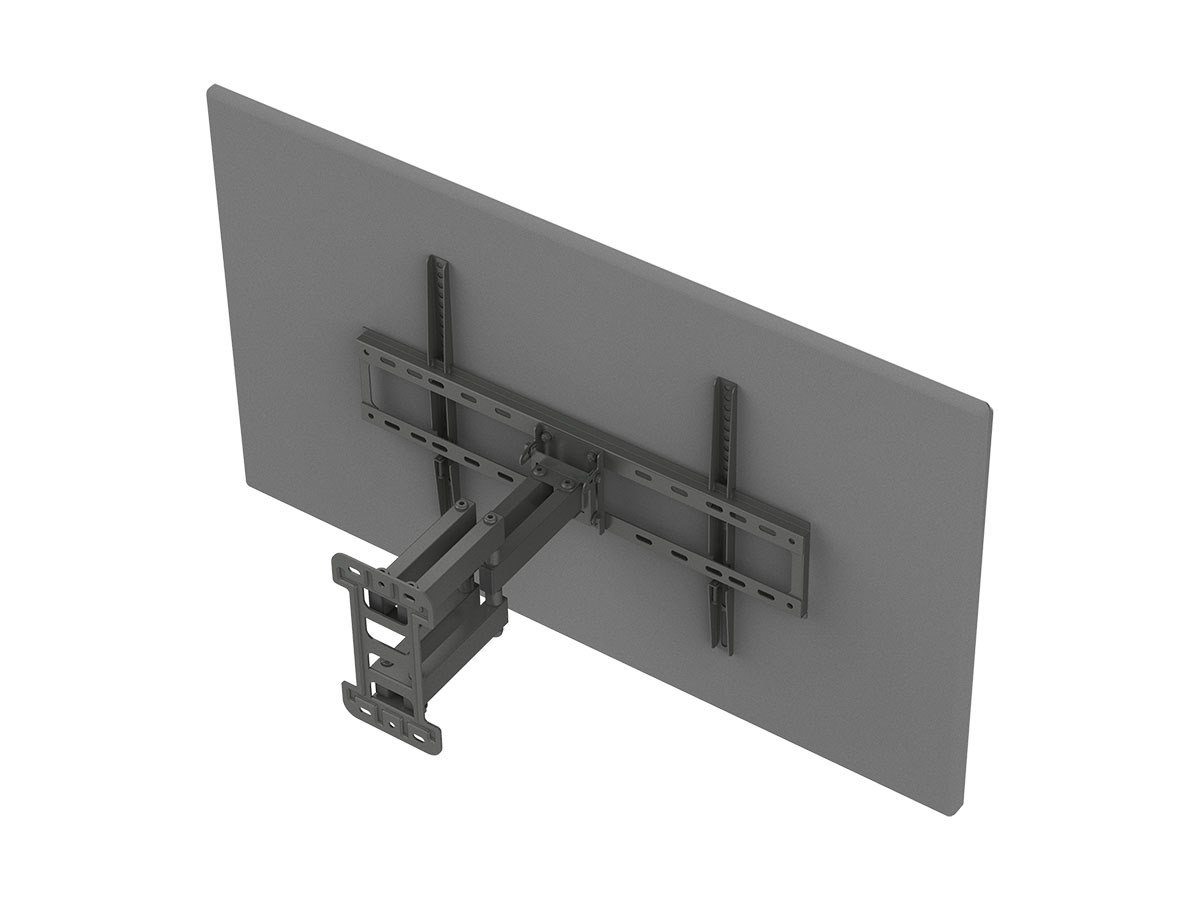 Titan Series Single Stud Dual Arm Full Motion Wall Mount for Large Displays Max 99lbs The next generation of Titan Series Full motion mounts brings the same top quality construction and safety, now featuring smarter, aesthetically pleasing designs. Monoprice wall mounts are constructed of high quality cold-formed steel for the ultimate in safety and reliability. Each wall mount has been strength tested to ensure it is safe for both your equipment and your family. Full motion wall offer the ultimate in comfort and flexibility. You can adjust your television for the most comfortable viewing angle, no matter where you choose to sit. Capable of mounting any television with a VESA mounting pattern between 200x200 and 600x400 to any type of wall, this mount is ideal for displays ranging up to 70" and weighing up to 99 lbs. It can be tilted from +2 ~ -18°, making it ideal for overhead installations.