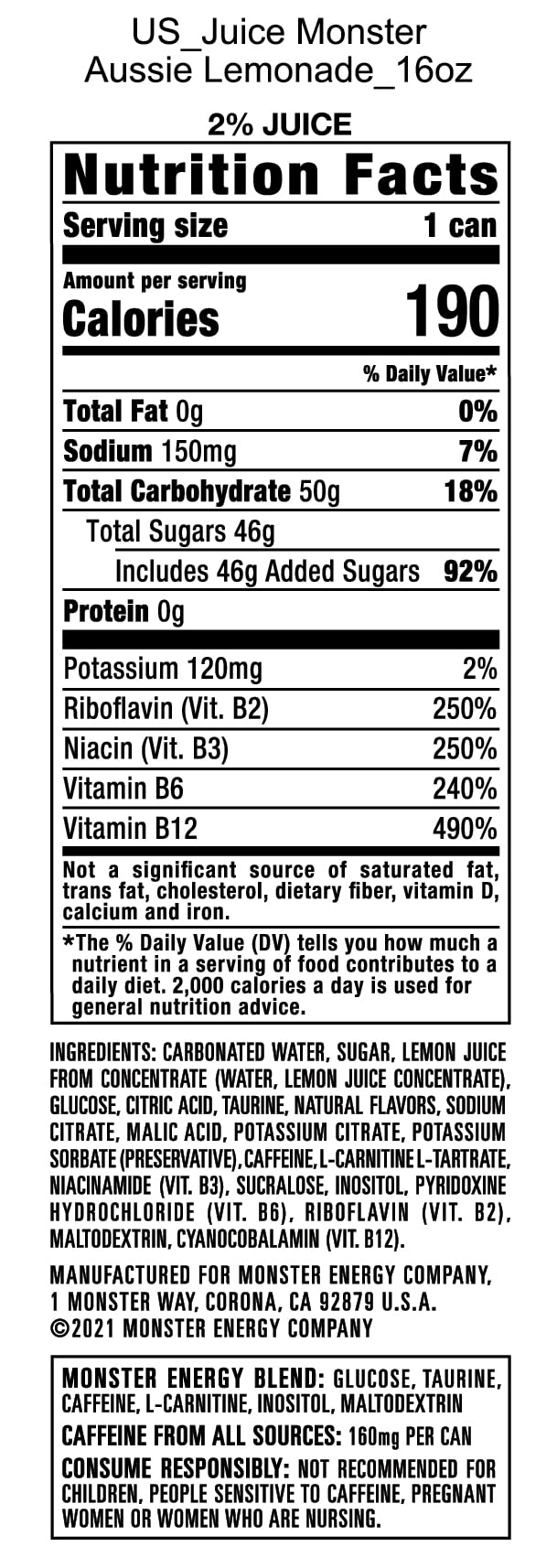 Inspired by the land down under with over 10,000 beaches, the Great Barrier Reef, and home to some of the most exotic citrus on earth comes Juice Monster Aussie Style Lemonade. Monster's twist on classic lemonade, we hit the ideal balance of tart and sweet with a burst of fresh citrus flavor. As always, it's chockers with our world-famous Monster Energy Blend. Crack a coldie and give it a go!