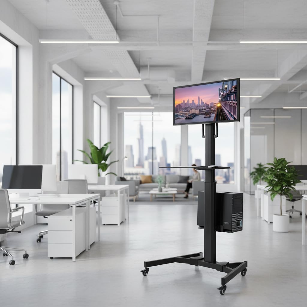 -Standing Workstation: Stability meets flexibility in this rolling computer stand, featuring a height-adjustable monitor mount and a floating CPU holder with buckle straps. This pc cart ensures your setup is both secure and customizable to your preferences. Fits monitors up to 32" with VESA 75x75mm or VESA 100x100mm.