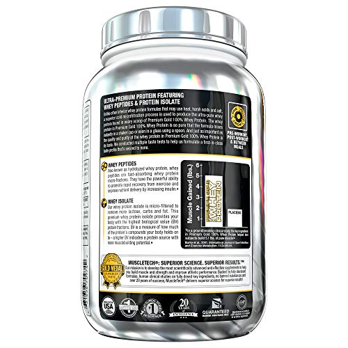 -WHEY PROTEIN POWDER – MuscleTech Premium Gold 100% Whey Protein is ultra-premium protein featuring whey protein isolate & peptides. Our whey protein isolate is micro-filtered to remove more lactose, carbs and fat. Whey peptides are fast-absorbing protein