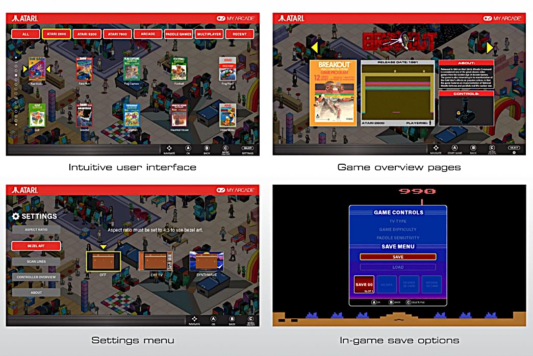 -Officially licensed Atari titles. Titles include Asteroids, Centipede, Millipede, Breakout, Missile Command, Crystal Castles and many more. Game save options.