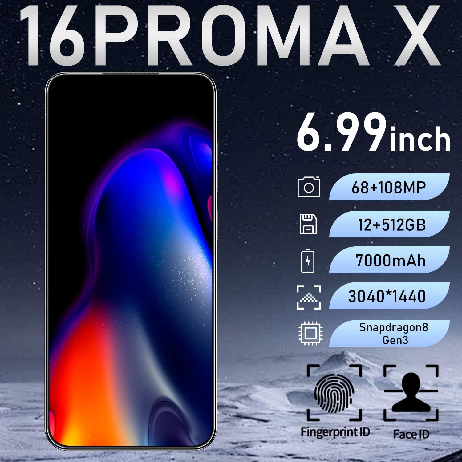 16 ProMa x Smartphone Unlocked Cell Phone, 6.99“ HD Screen5G Phone, 12+512GB phone unlocked, Android 13.0, 68+108MP Zoom Camera, Fingerprint Button Unlock-and take photos,Dual SIM, Face ID