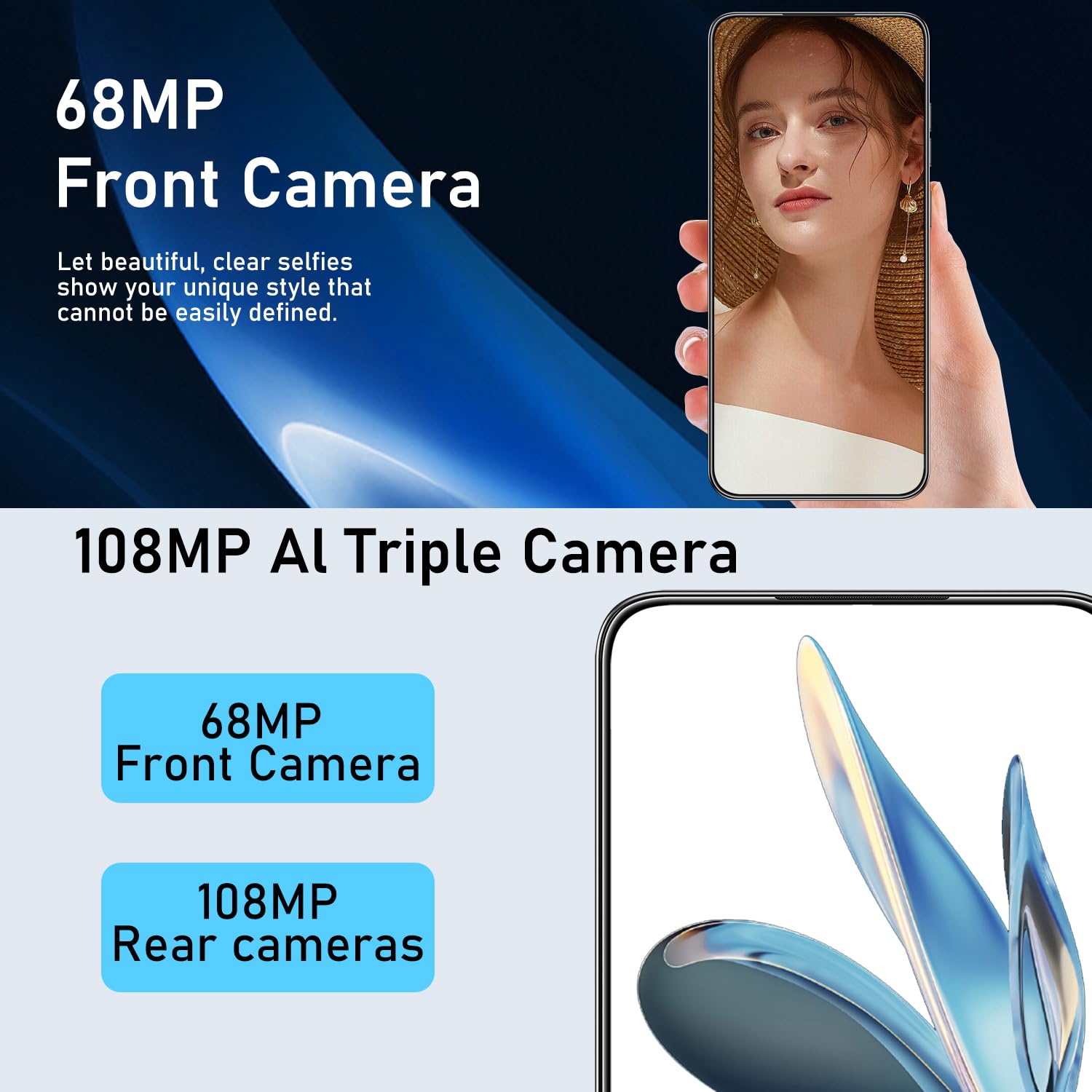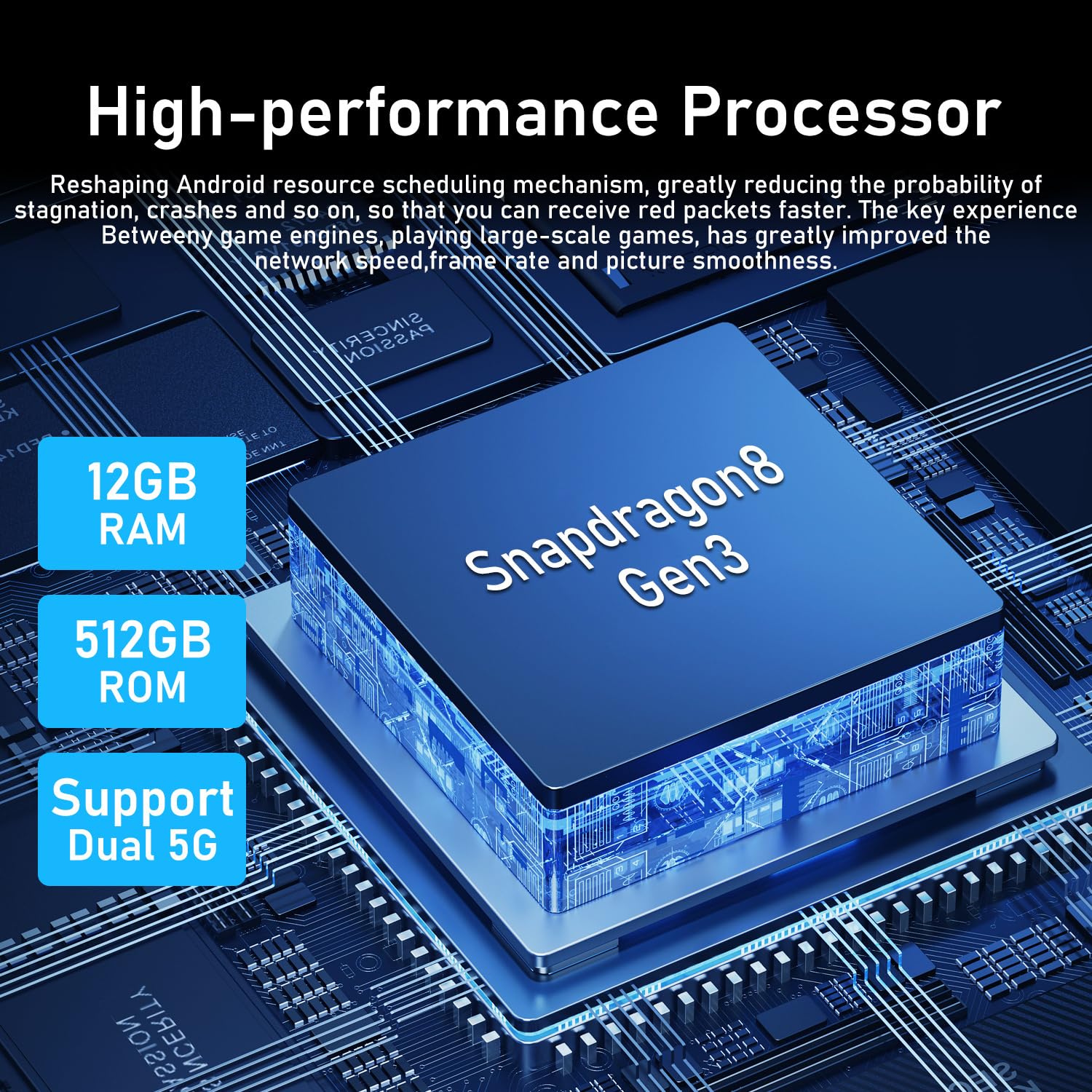 -【108MP+68MP Camera & 12Core Processor】Snapdragon8 Gen3 12 Core CPU with 12GB+512GB 108MP main camera, paired with enhanced image processing algorithms, makes every photo exceptionally sharp and detailed, while still striking and lifelike. The cell phone is equipped with the powerful 12 CPU Core processor, which can dramatically improve the running speed, network, frame rate and picture smoothness, you will no more need to suffer from phone lag.