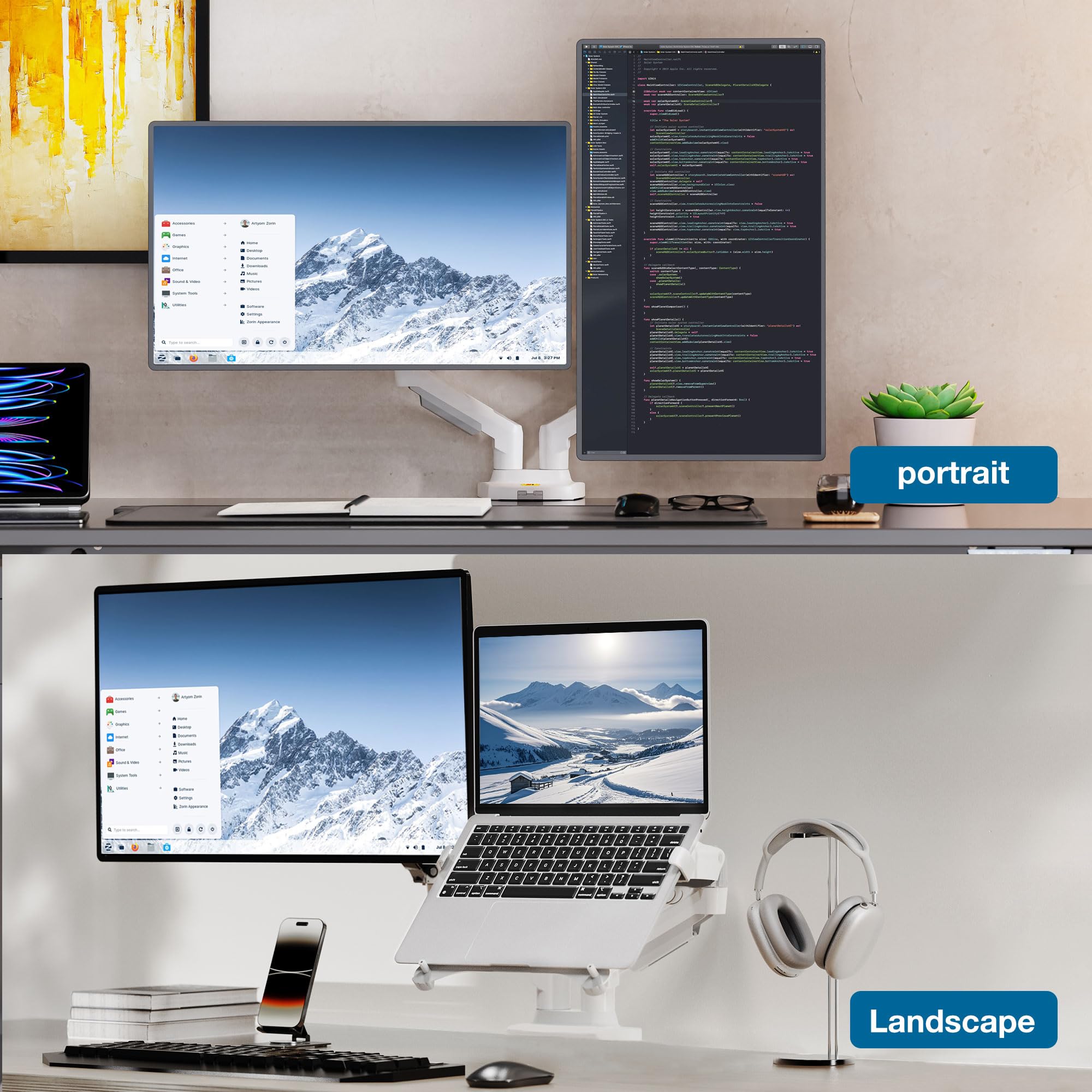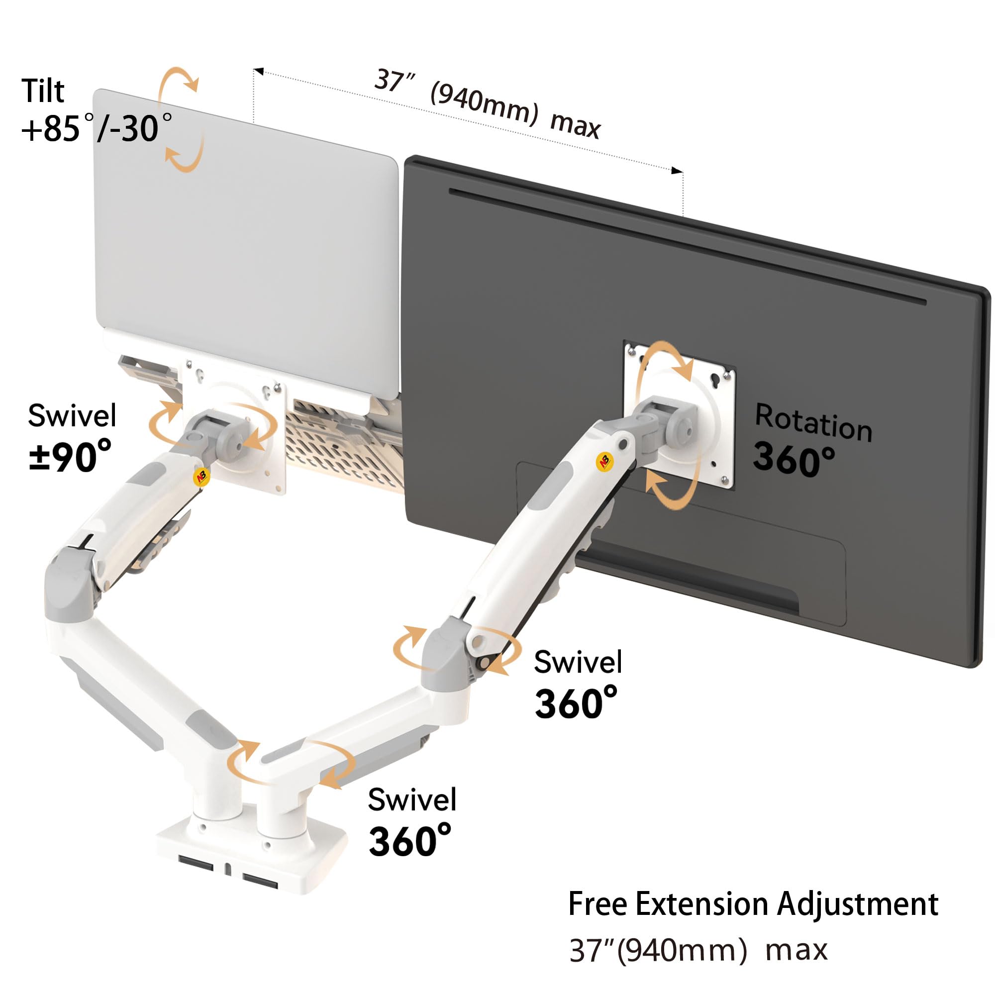 -【Fully Adjustment】 Built in gas spring mechanism, the tray is detachable and laptop monitor mount height is adjustable. The monitor arms easily tilt, swivel and rotate (swivel: -90°/+90°, rotate: 360°, tilt: -30°/+85°). The max height from VESA Center to table is 15.7"(400mm). The max extension distance of 2 VESA Center is 37"(940mm) provides you more choices to get a comfortable position.