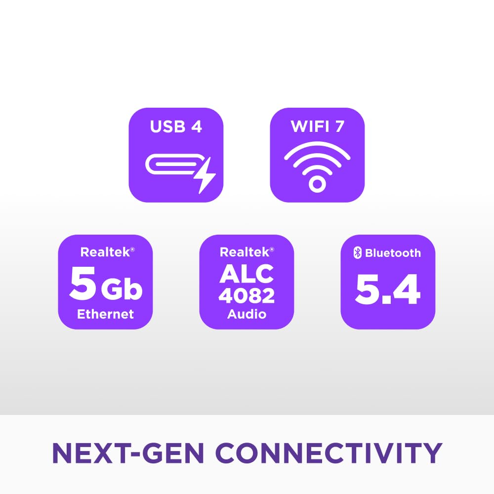 -NEXT-GEN CONNECTIVITY — USB 4 (40 Gbps), Wi-Fi 7, and 5GbE deliver blazing-fast data transfers and ultra-low latency networking.